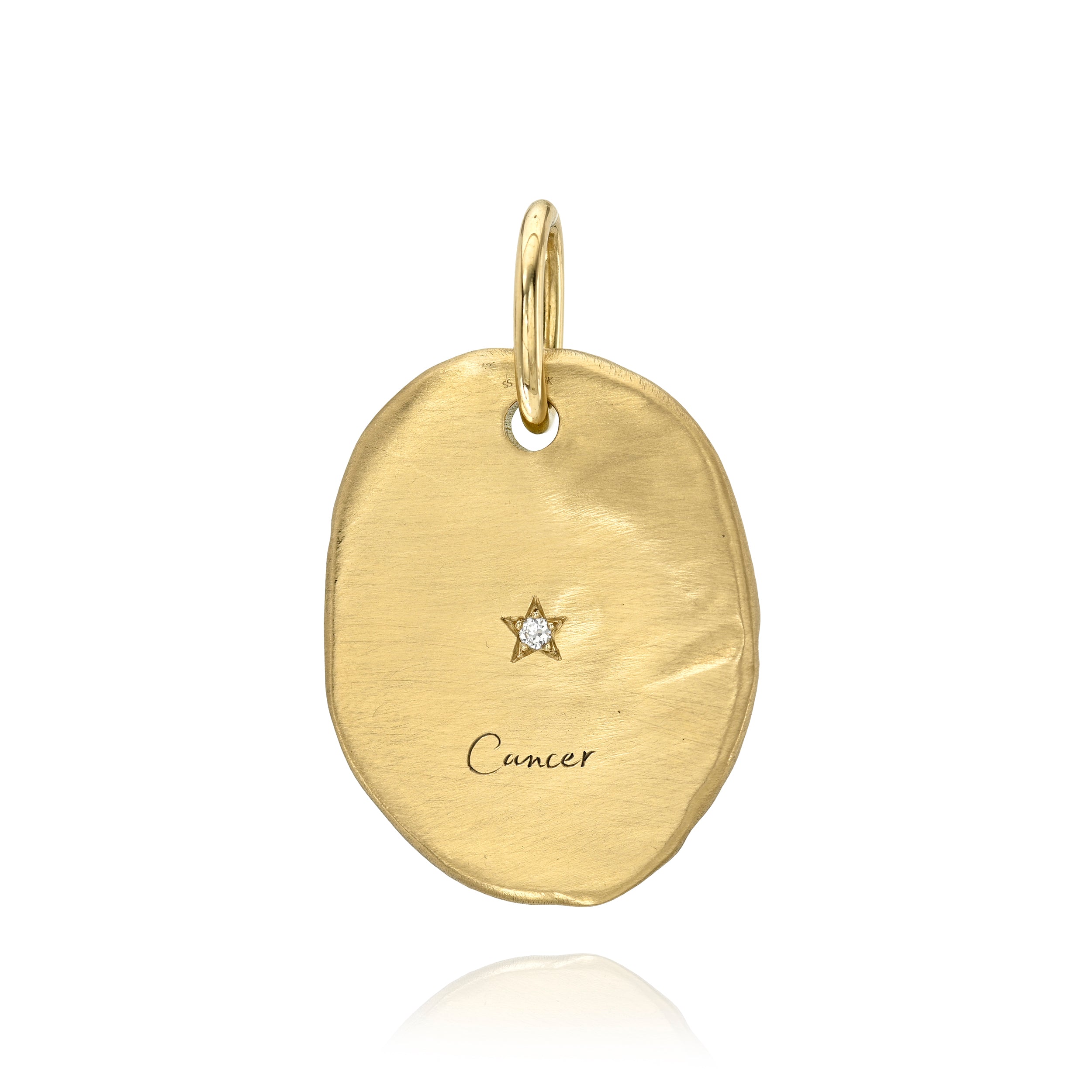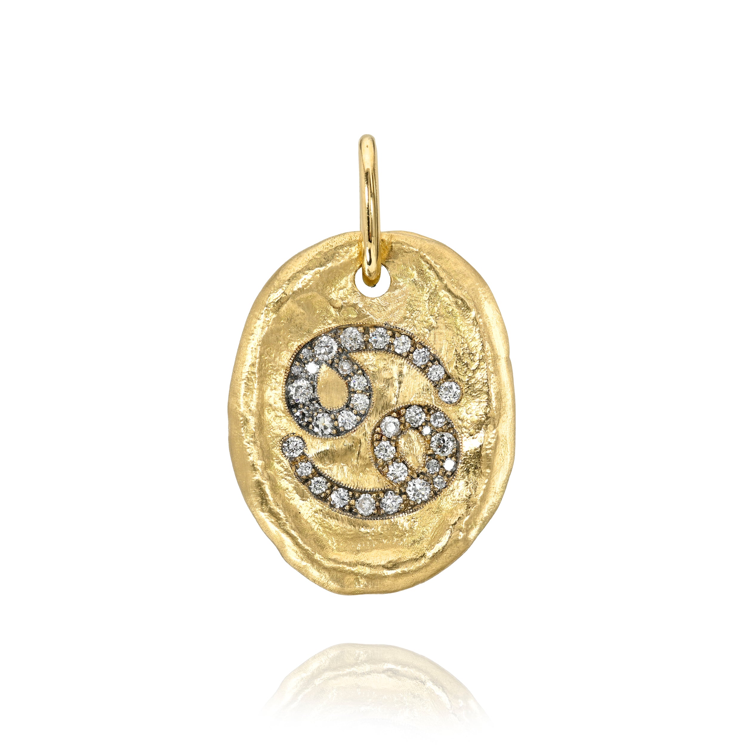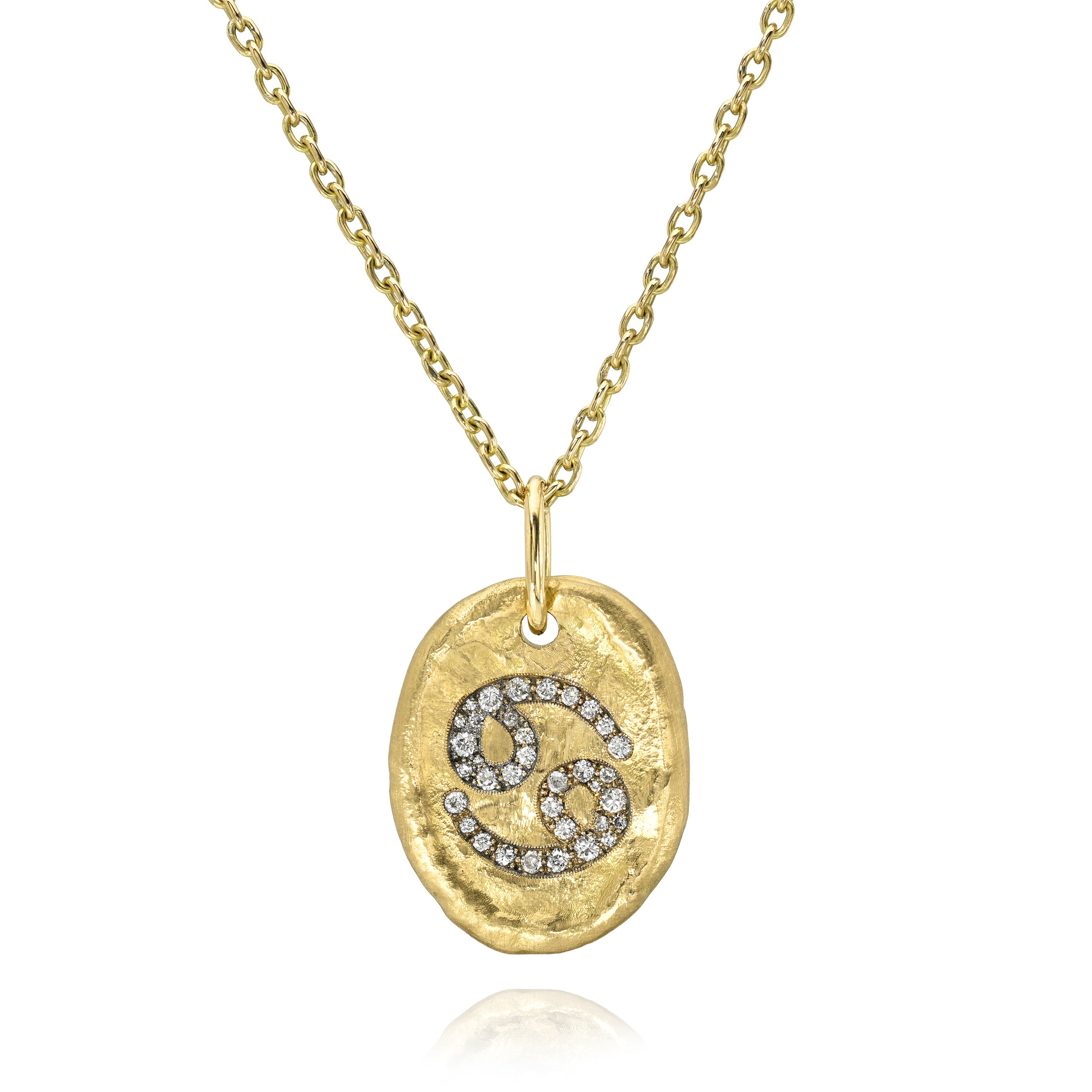 0.96ctw various old cut and round brilliant cut diamonds cobblestone set in a handcrafted, engraved hammer finished 18K yellow gold Cancer zodiac themed oval shape pendant. Shown on our Kai chain.