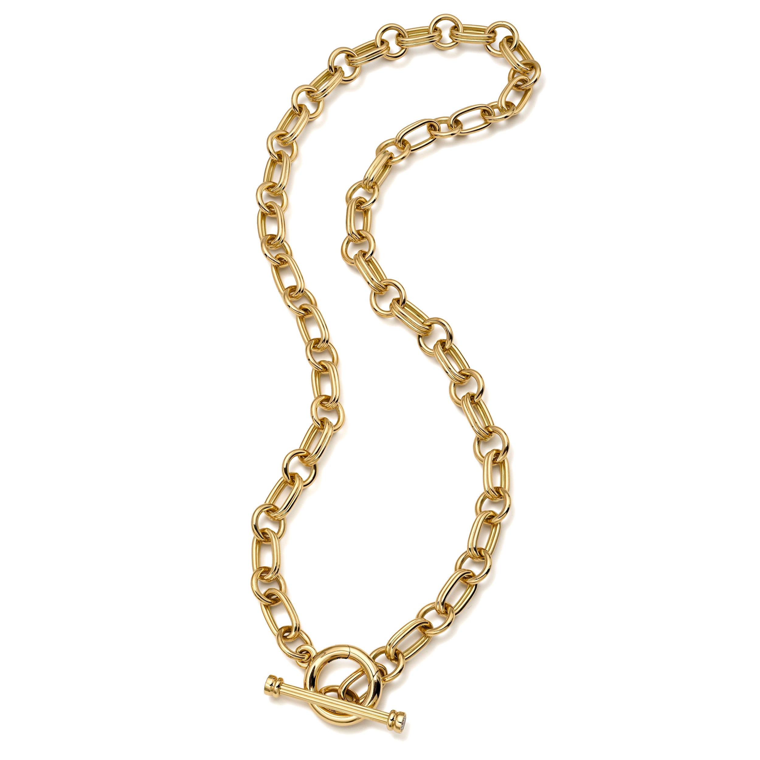 Handcrafted 18K yellow gold link toggle necklace featuring 0.32ctw G-H/VS-SI old European cut diamonds.