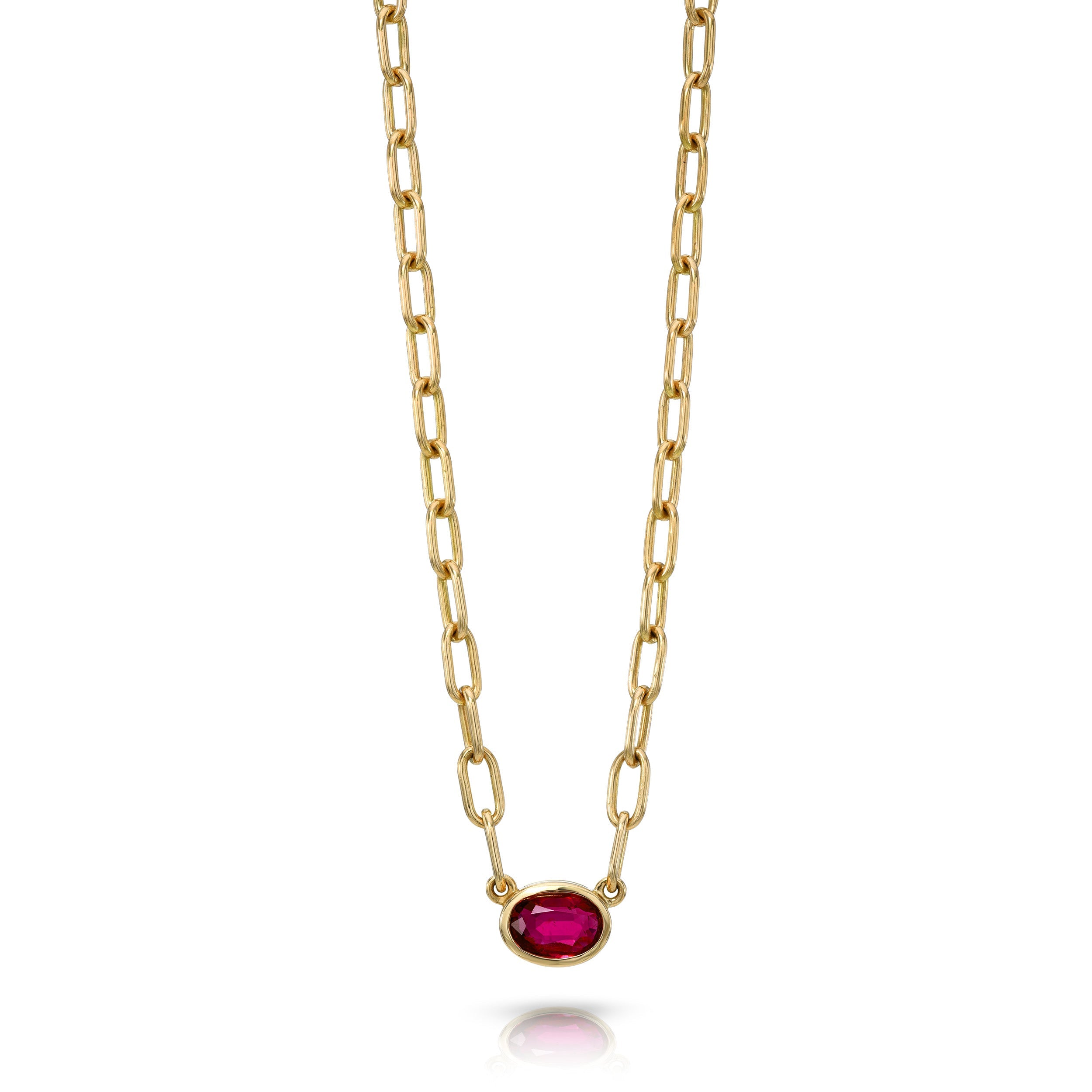 1.07ct GIA certified Madagascan oval cut red ruby bezel set on our handcrafted 18K yellow gold Bond chain.