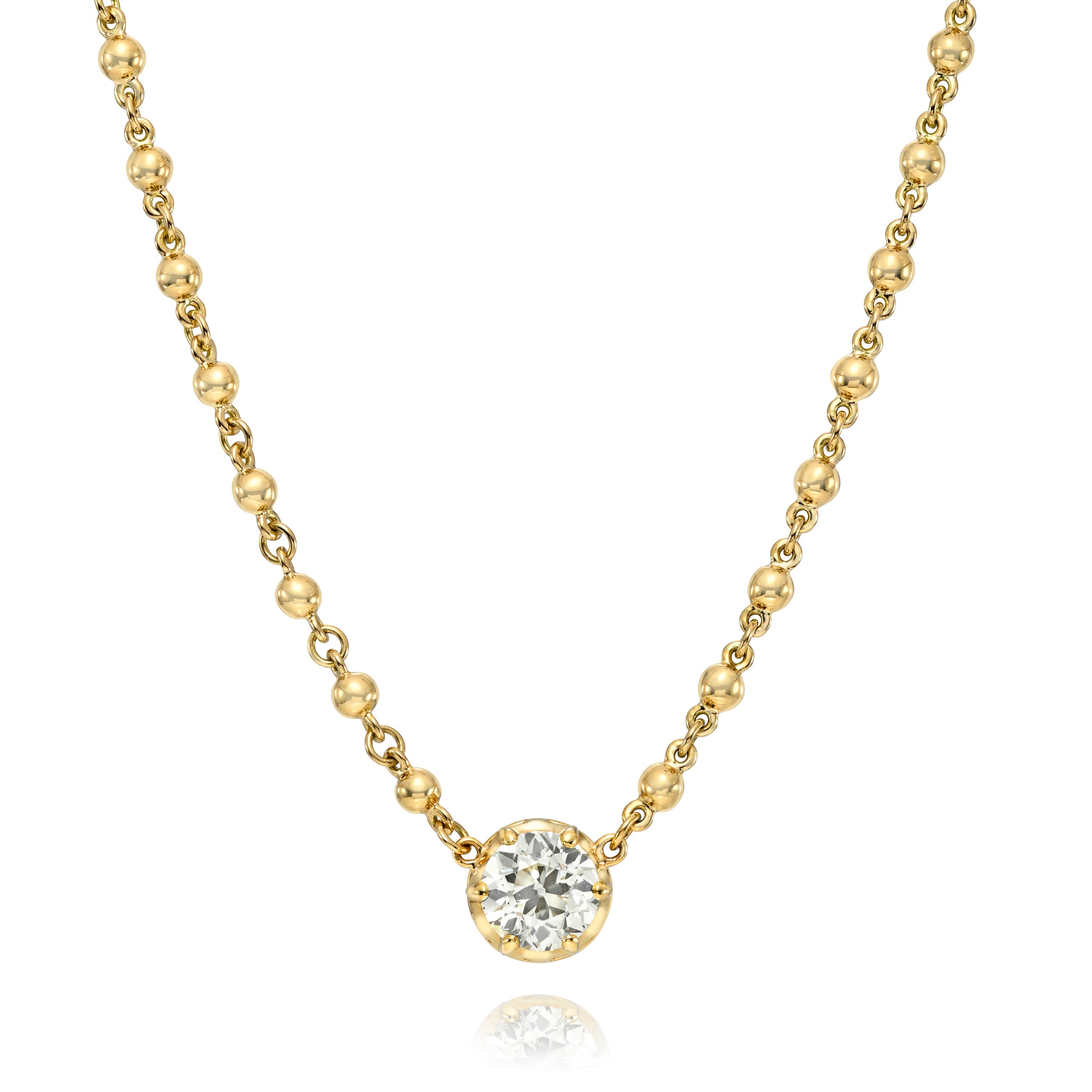 2.24ct N/SI1 GIA certified old European cut diamond prong set on our handcrafted 18K yellow gold Rosary chain.