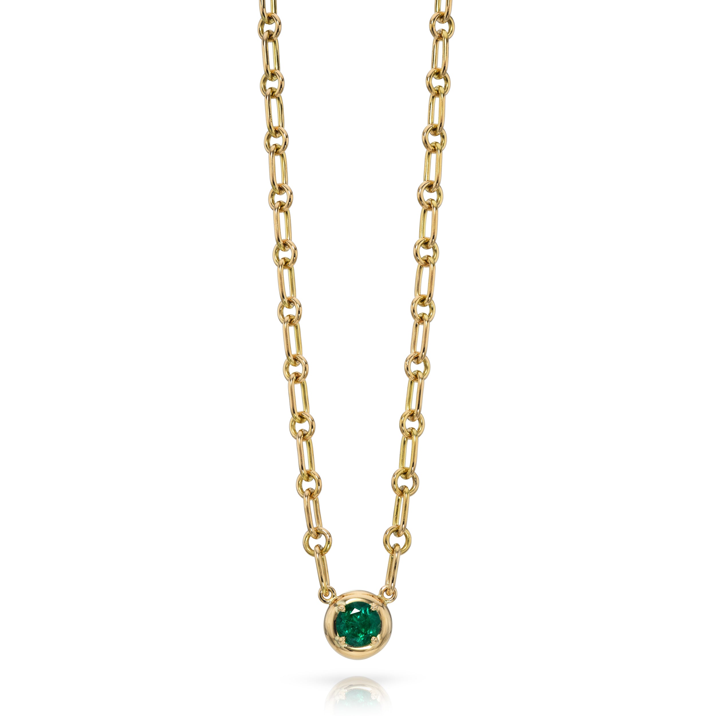 0.58ct round cut green emerald prong set on our handcrafted 18K yellow gold Mini Lo chain.