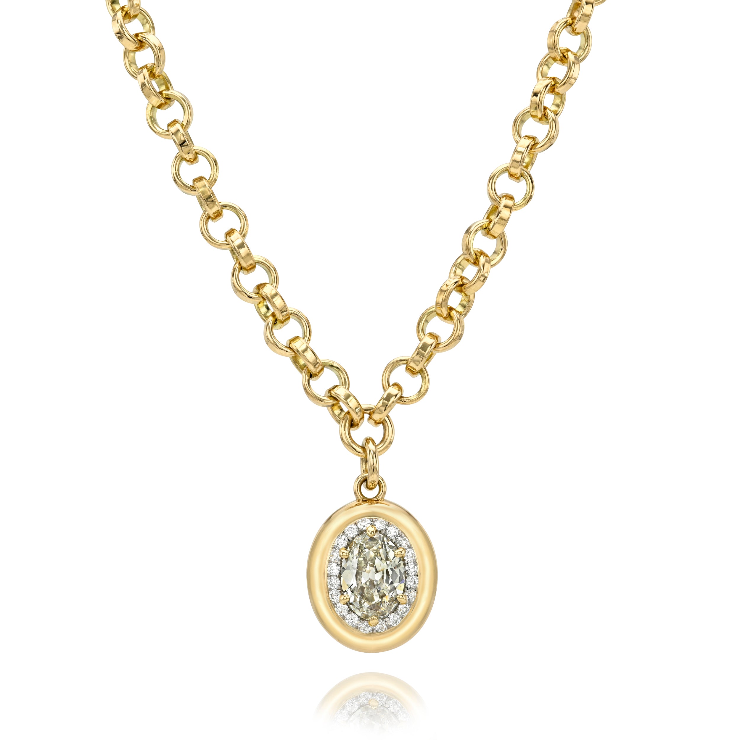 1.65ct L/SI1 GIA certified pear-shape diamond surrounded by a platinum halo featuring 0.28ctw old European cut accent diamonds mounted in a handcrafted 18K yellow gold pendant drop set on our Dahlia chain.