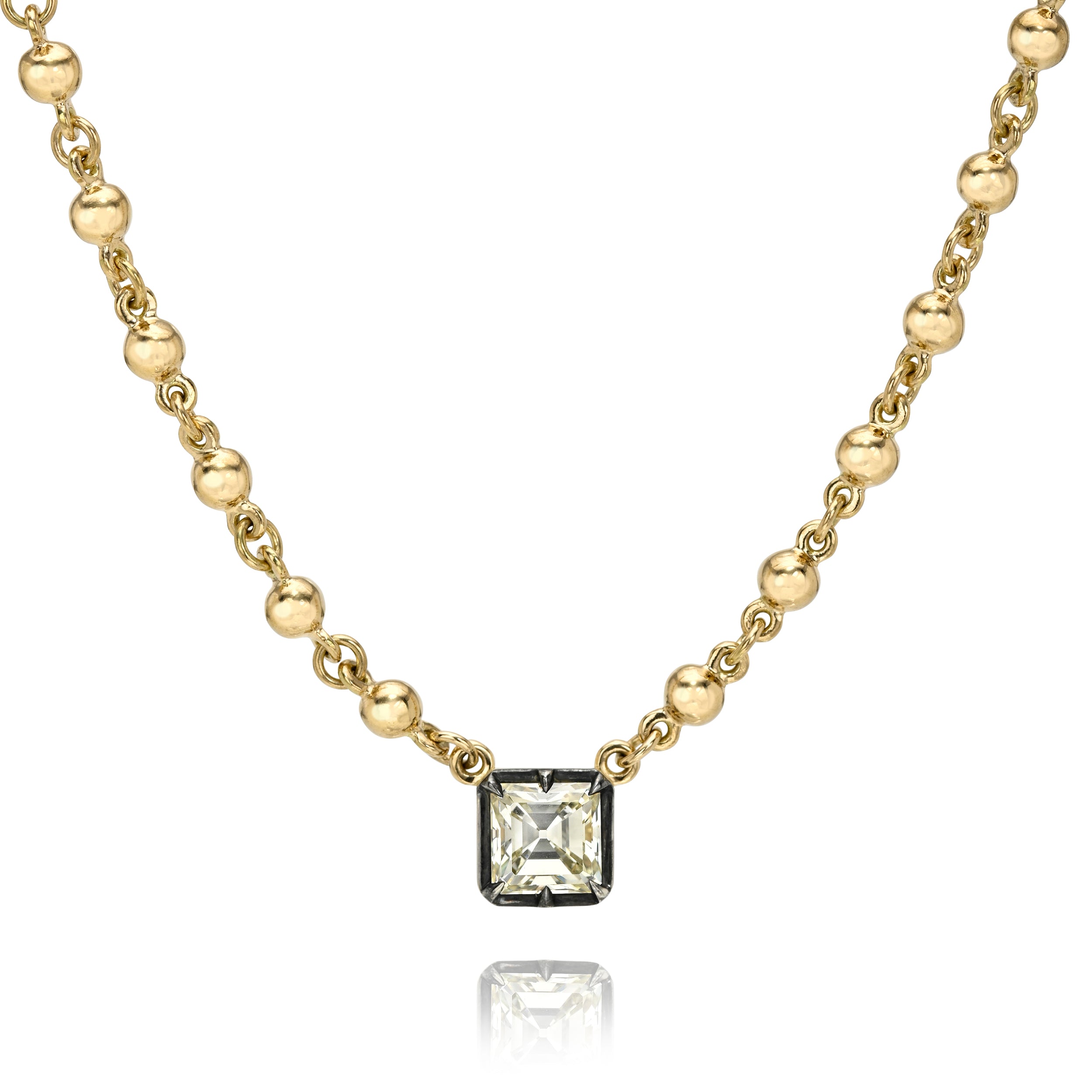 1.11ct U-V/VS1 GIA certified emerald cut diamond prong set in a handcrafted oxidized sterling silver pendant on our 18K yellow gold Rosary chain.