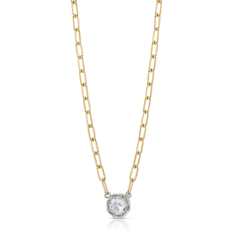 0.55ct G/SI1 GIA certified rose cut diamond prong set in an 18K champagne white gold pendant on our handcrafted 18K yellow gold Bond chain.