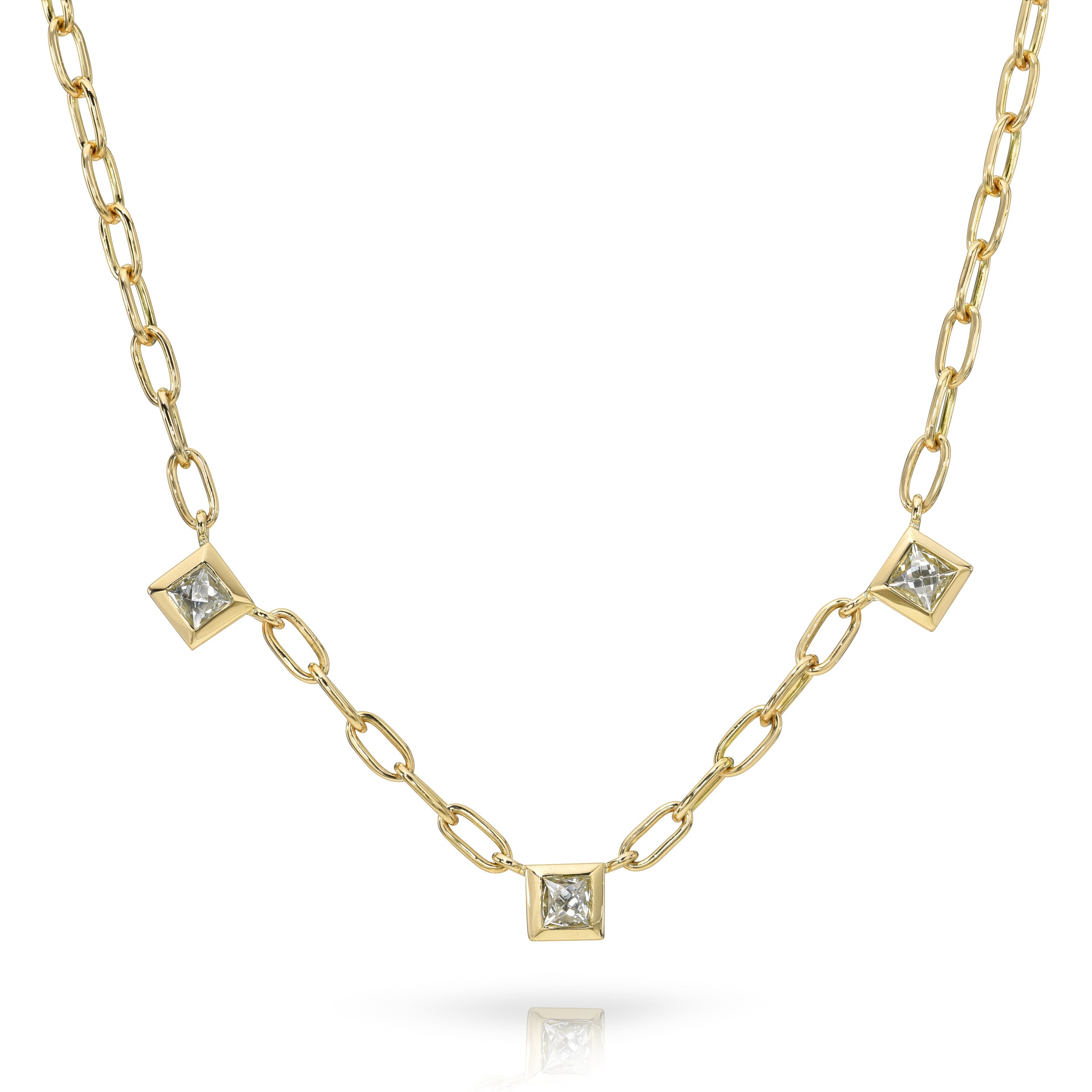 1.05ctw J-K/VS French cut diamonds bezel set on out handcrafted 18K yellow gold Bond chain.
