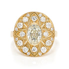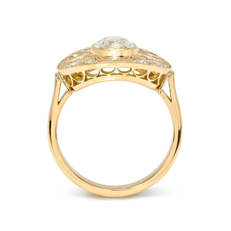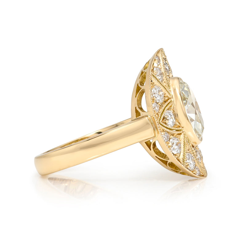 1.36ct L/VS2 GIA certified oval cut diamond bezel set with 0.79ctw old European cut accent diamonds set in a handcrafted 18K yellow gold mounting.