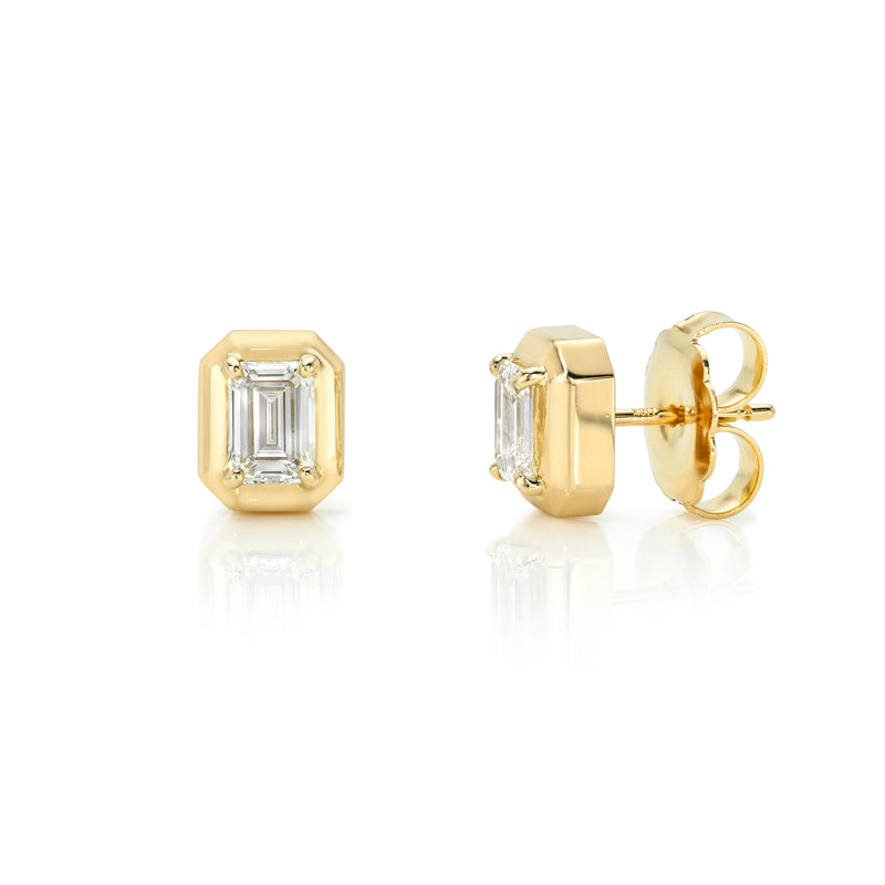 1.44ctw K-M/VVS2-VVS1 GIA certified emerald cut diamonds prong set in handcrafted 18K yellow gold stud earrings.