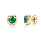 3.41ctw GIA certified Zambian round cut green emeralds prong set in handcrafted 18K yellow gold stud earrings.