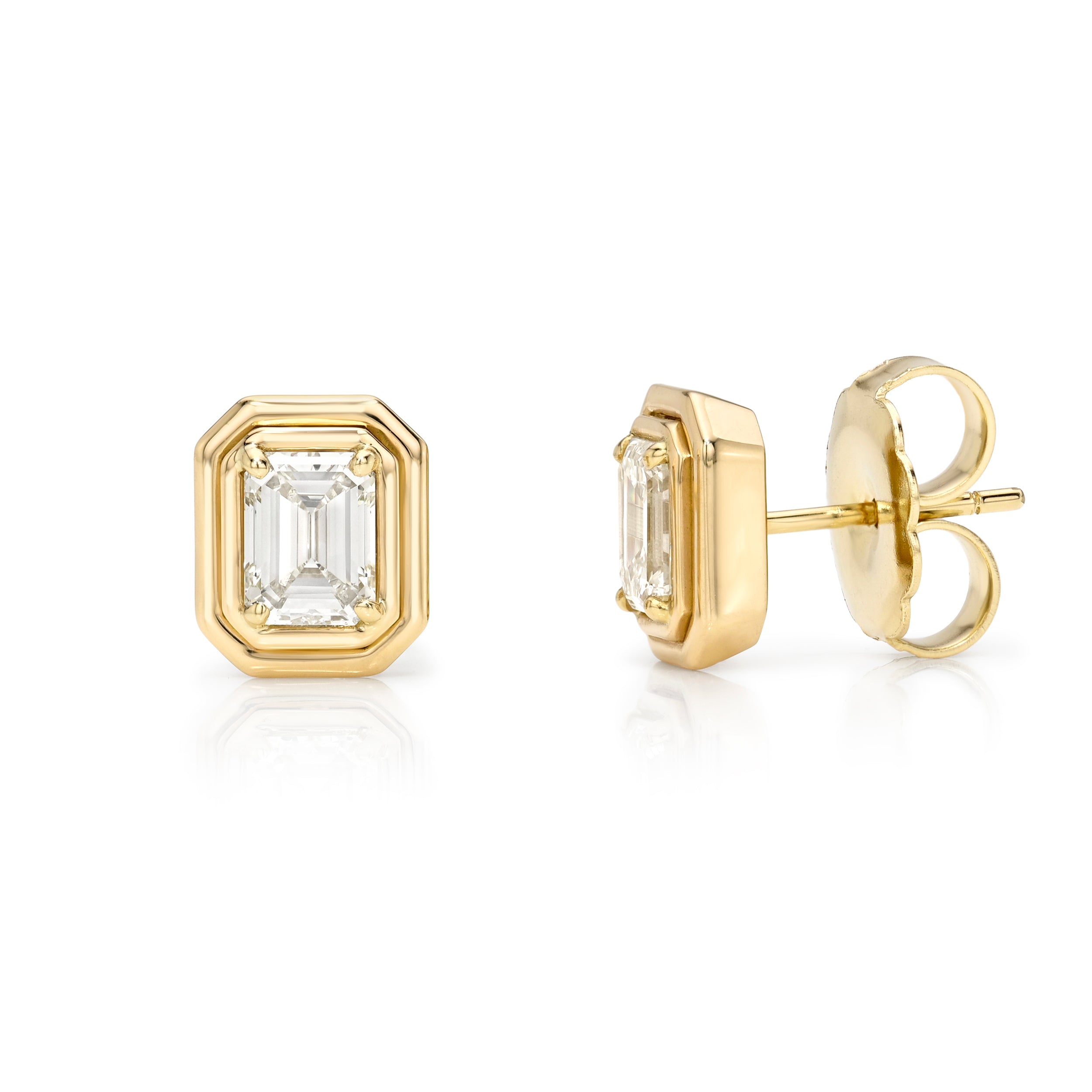 2.02ctw L/VS2-VVS2 GIA certified emerald cut diamonds prong set in handcrafted 18K yellow gold stud earrings.