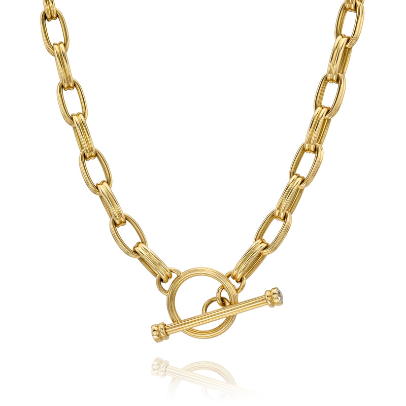 Handcrafted 18K yellow gold link toggle necklace featuring 0.34ctw G-H/VS-SI old European cut diamonds.