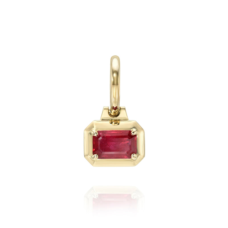 1.02ct emerald cut red ruby prong set in a handcrafted 18K yellow gold pendant.