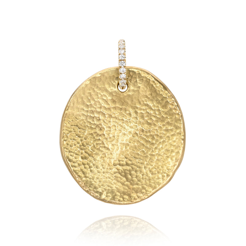 Handcrafted 18K yellow gold medallion hammer finished pendant featuring 0.12ctw pavé set old European cut diamonds.