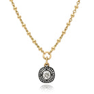 0.87ct I-J/VS antique cushion cut diamond surrounded by 0.12ctw old European cut diamond in a handcrafted oxidized sterling silver pendant drop set on our 18K yellow gold Mini Rosary chain.