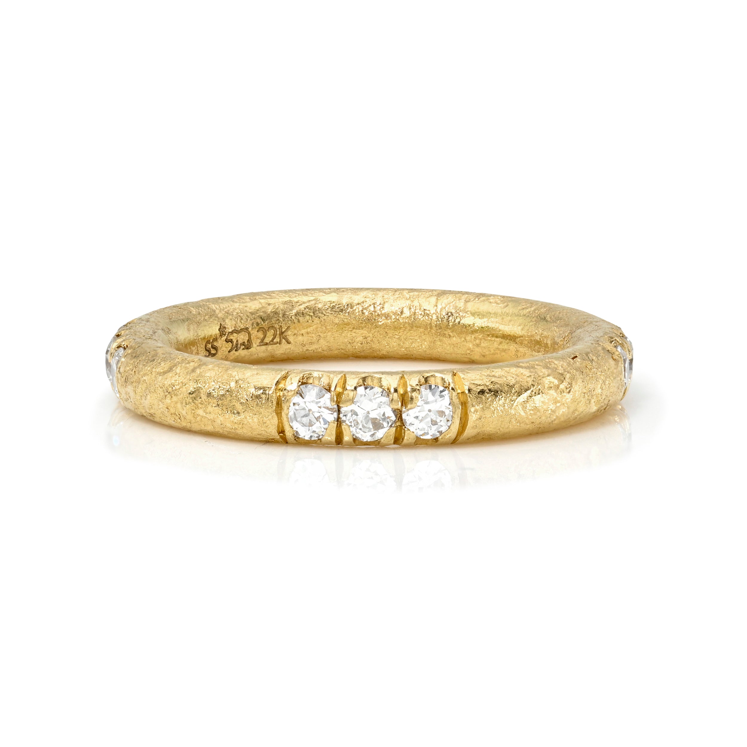 Approximately 0.60ctw old European cut diamonds prong set in a handcrafted hammered finish 22K yellow gold semi-eternity band.