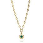 0.54ct round cut green emerald prong set and surrounded by a platinum halo featuring 0.09ctw pavé set old European cut accent diamonds on our handcrafted 18K yellow gold Mini Lo chain.