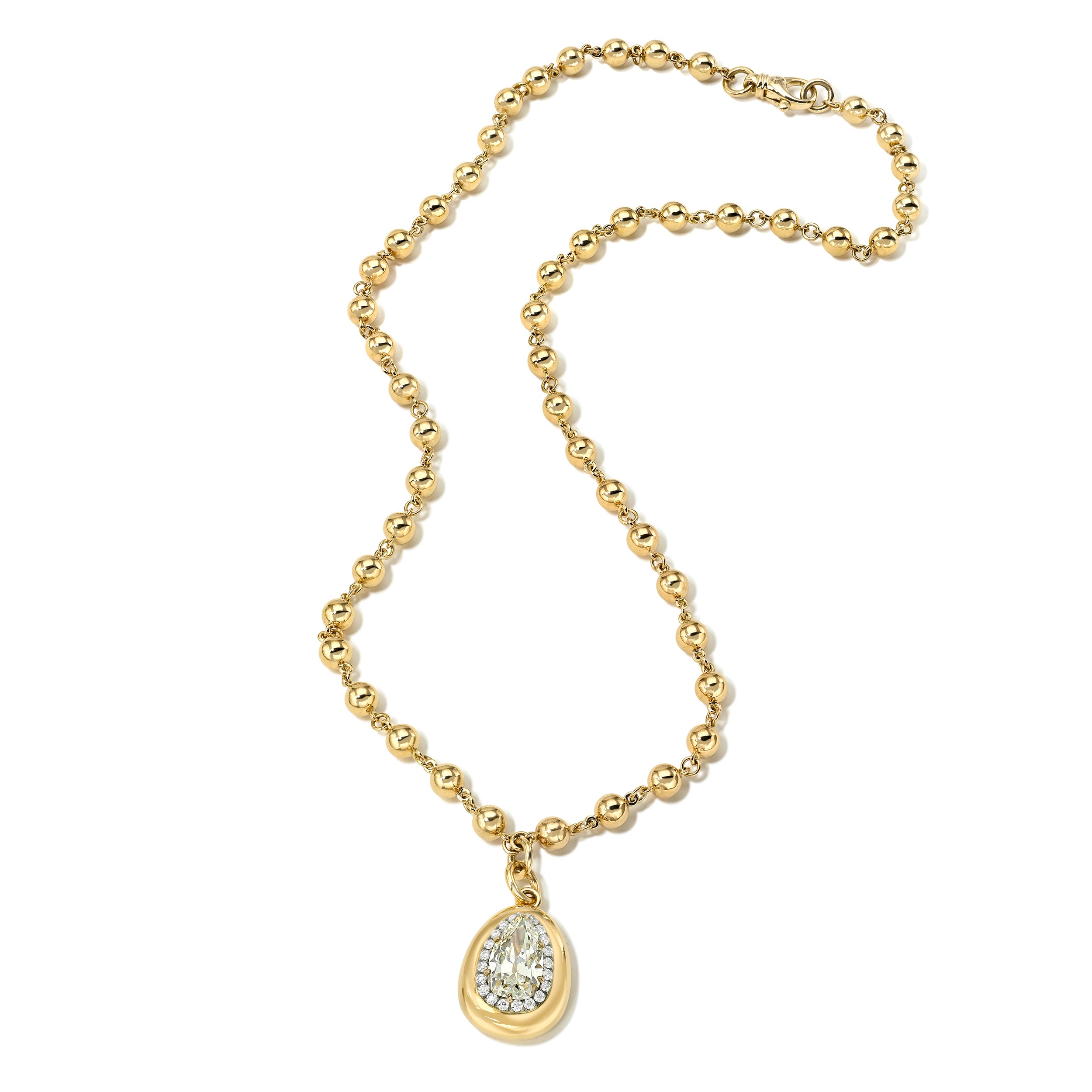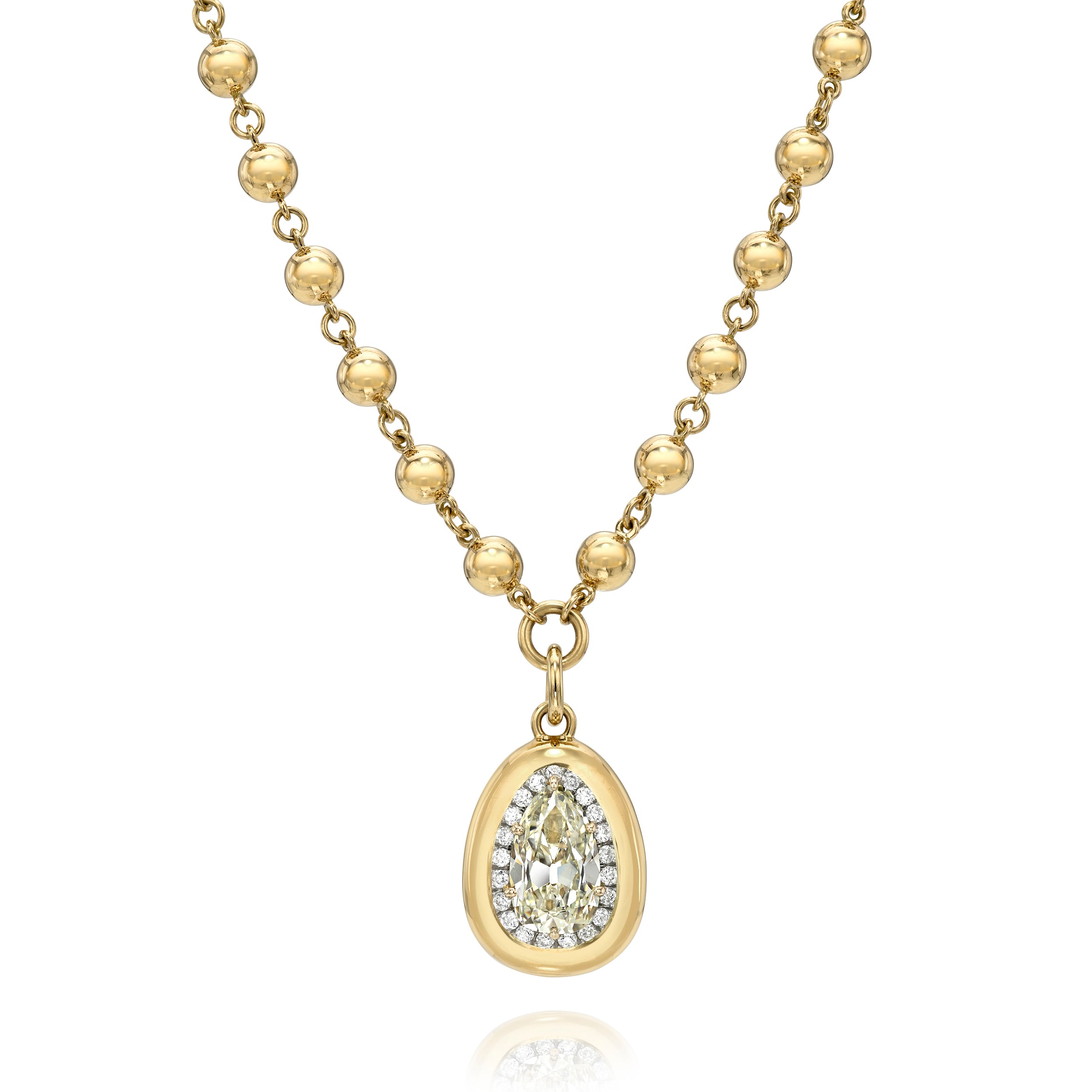 2.76ct L/SI1 GIA certified pear-shape diamond prong set and surrounded by a platinum halo featuring 0.30ctw pavé set old European cut accent diamonds on our handcrafted 18K yellow gold Mirella necklace.