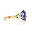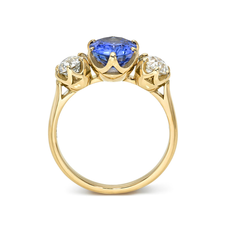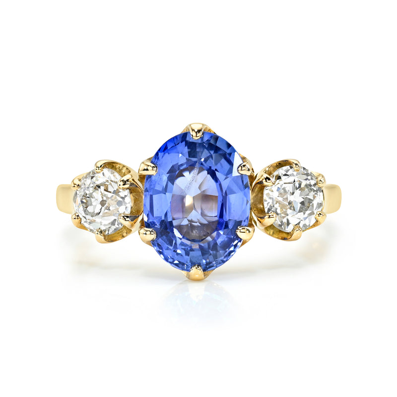 2.58ct GIA certified Sri Lankan oval cut blue sapphire flanked by 0.78ctw I-J/VS-SI old European cut accent diamonds prong set in a handcrafted 18K yellow gold mounting.