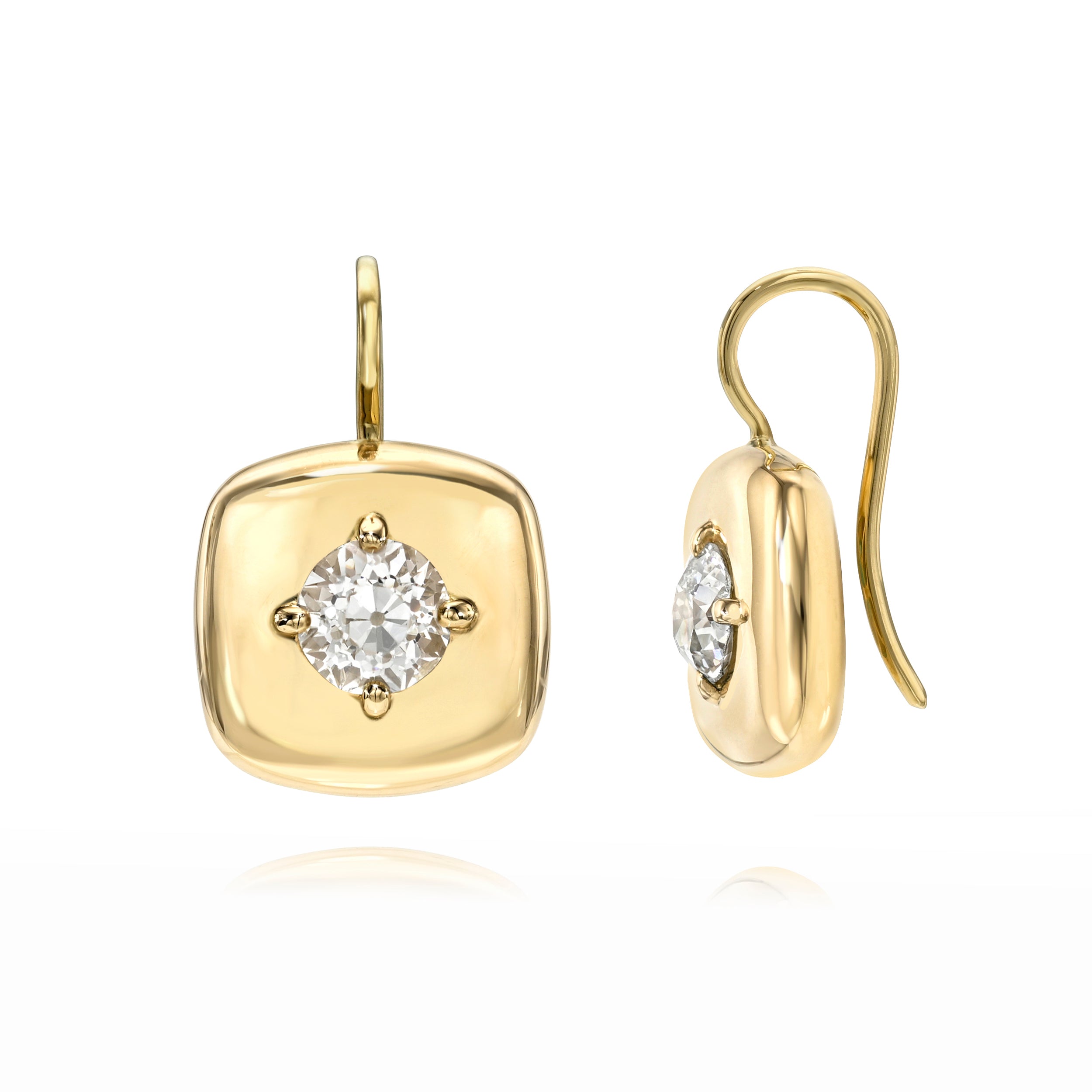 1.01ctw N/VS1-VS2 GIA certified old European cut diamonds prong set in handcrafted 18K yellow gold drop earrings.