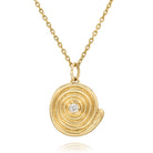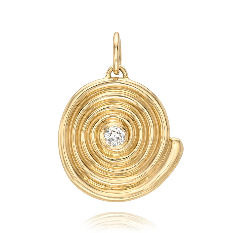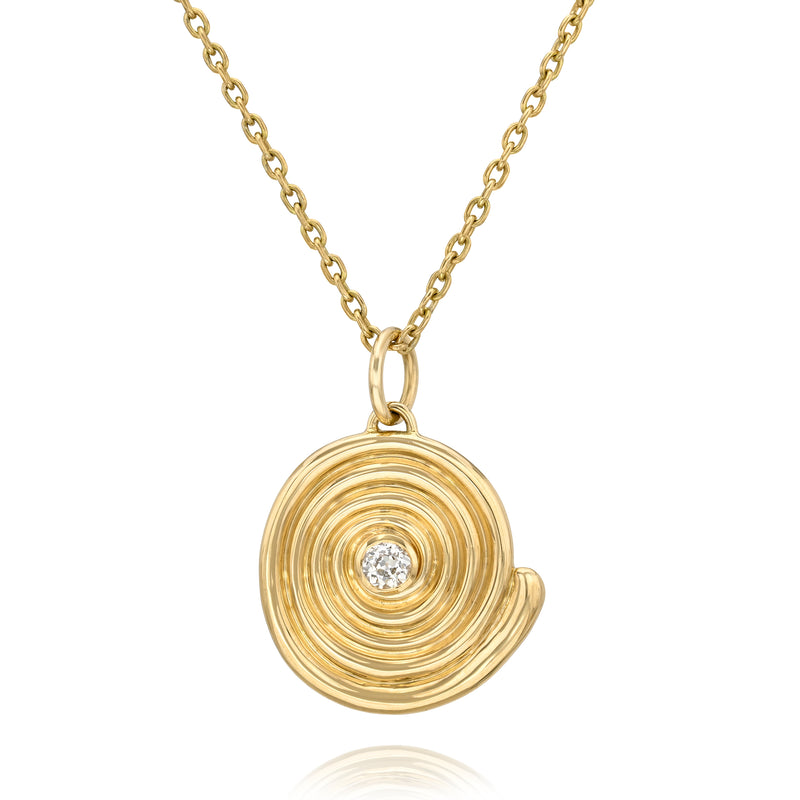 Handcrafted 18K yellow gold spiral pendant featuring a 0.86ct M/VS1 GIA certified bezel set old European cut diamond, also shown on our Kai chain.