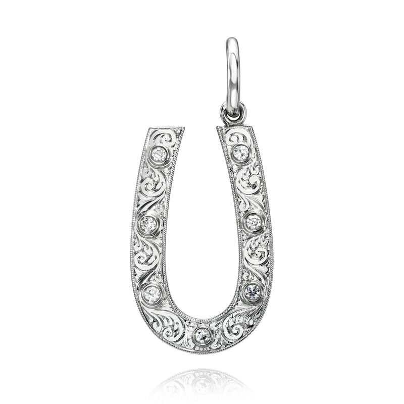 Approximately 0.25ctw G-H/VS old European cut diamonds bezel set in a handcrafted, hand-engraved horseshoe shaped pendant.