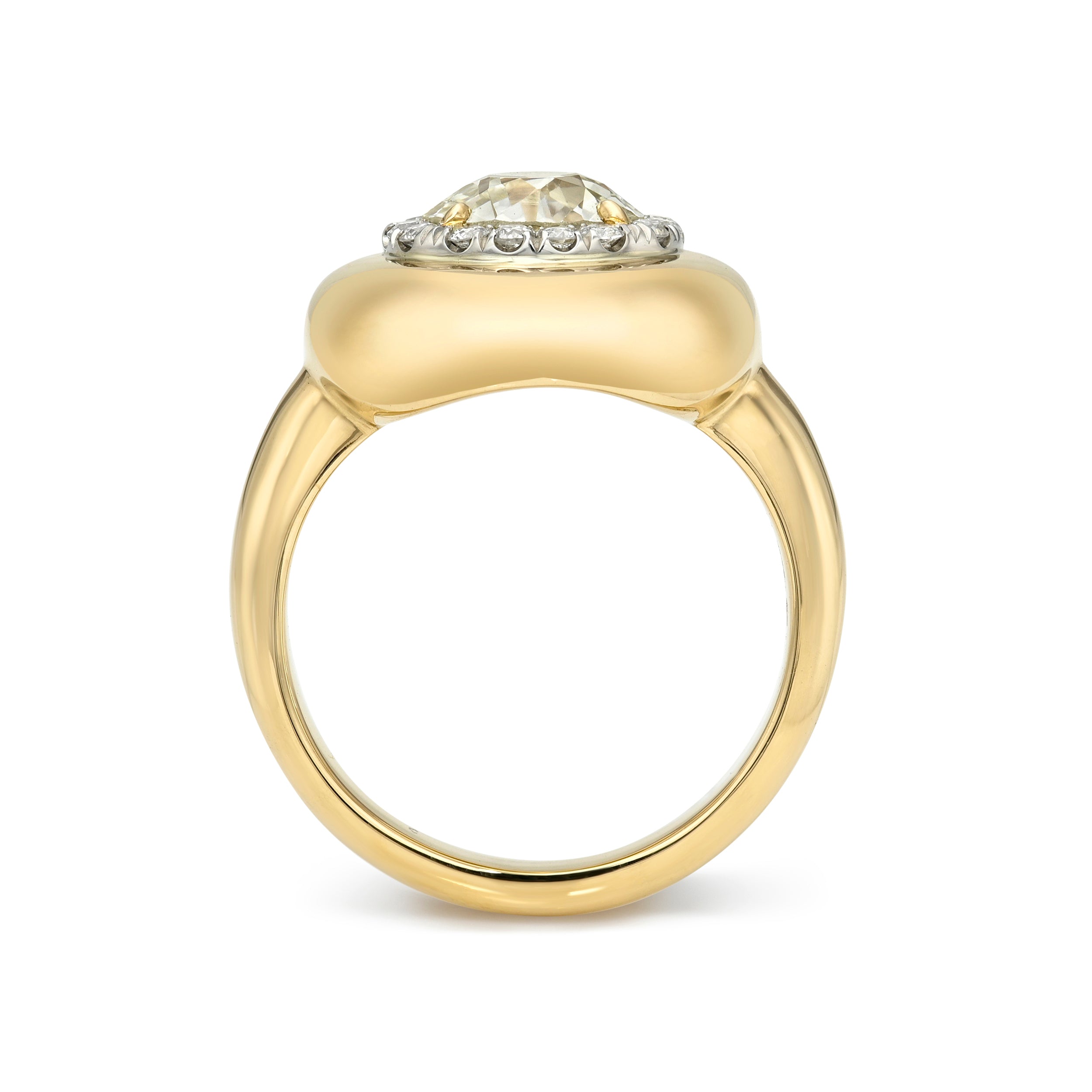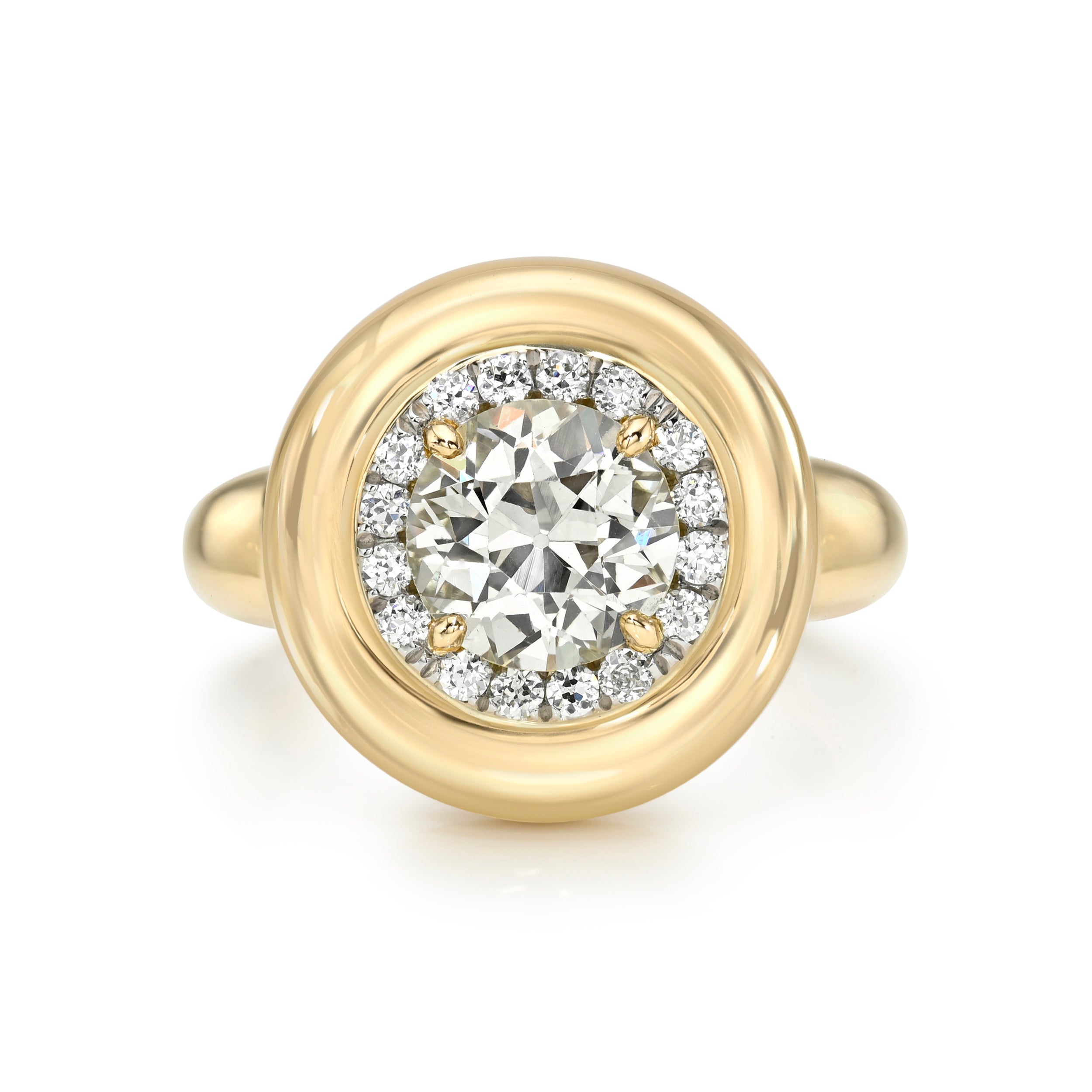 1.58ct N/VS2 GIA certified old European cut diamond prong set and surrounded by a platinum halo featuring 0.23ctw pavé set old European cut accent diamonds in a handcrafted 18K yellow gold mounting.