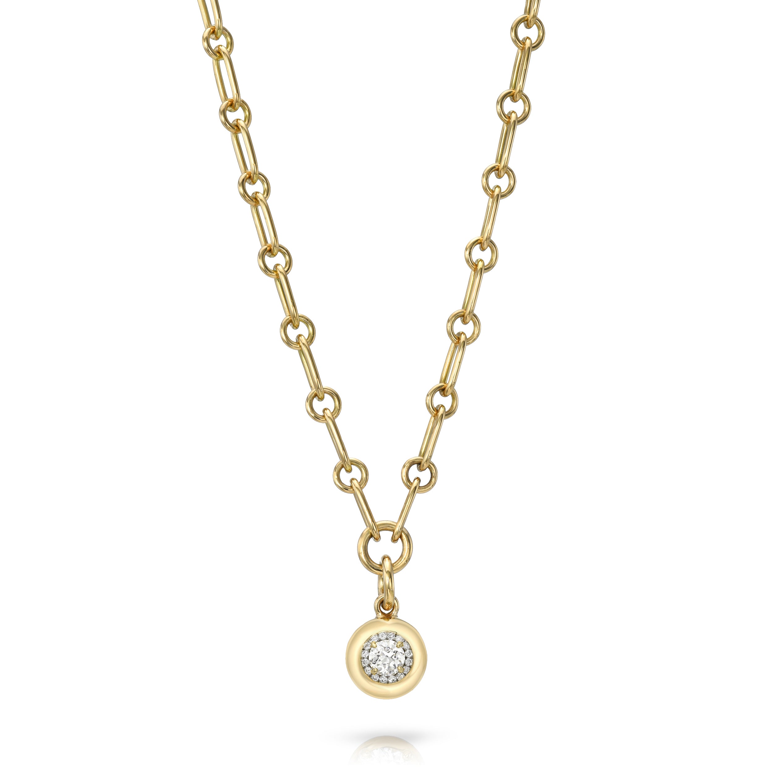 0.51ct I/SI1 GIA certified old European cut diamond prong set and surrounded by a platinum halo featuring 0.09ctw pavé set old European cut accent diamonds on our handcrafted 18K yellow gold Mini Lo chain.