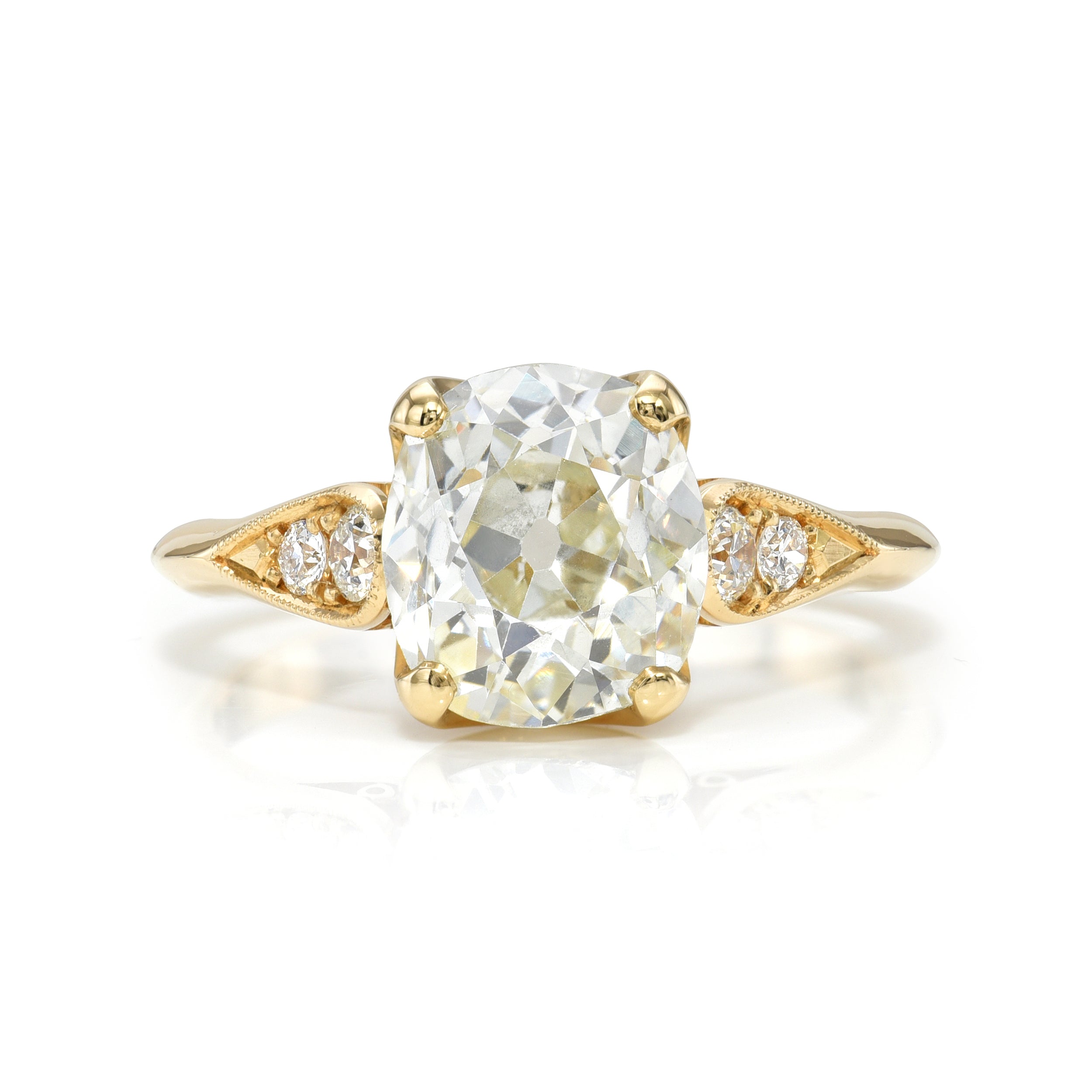 2.35ct L/VS1 GIA certified antique cushion cut diamond with 0.15ctw old European cut accent diamonds prong set in a handcrafted 18K yellow gold mounting.