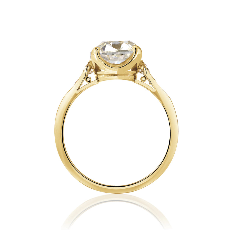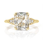 3.35ct N/SI1 GIA certified antique cushion cut diamond with 0.16ctw old European cut accent diamonds prong set in a handcrafted 18K yellow gold mounting.