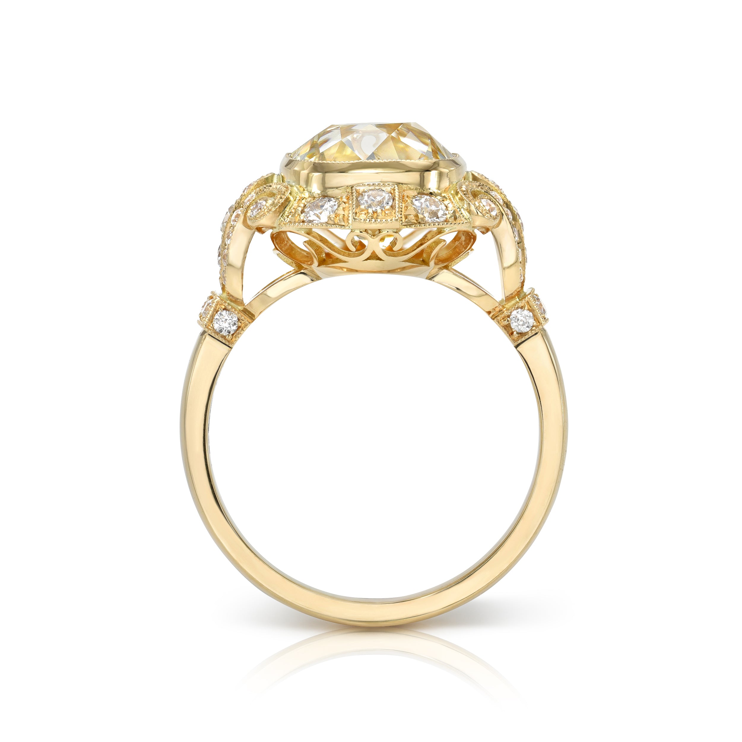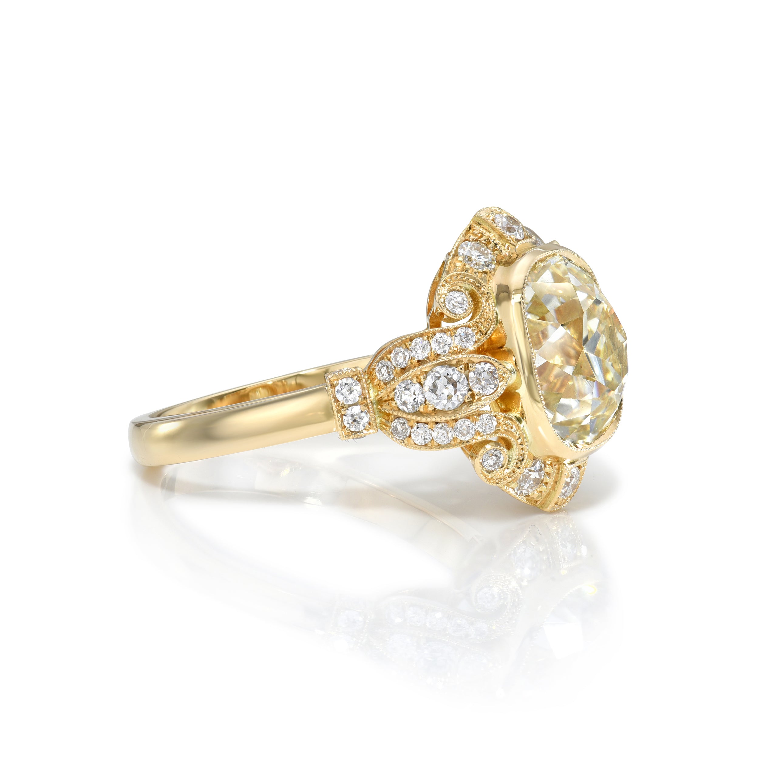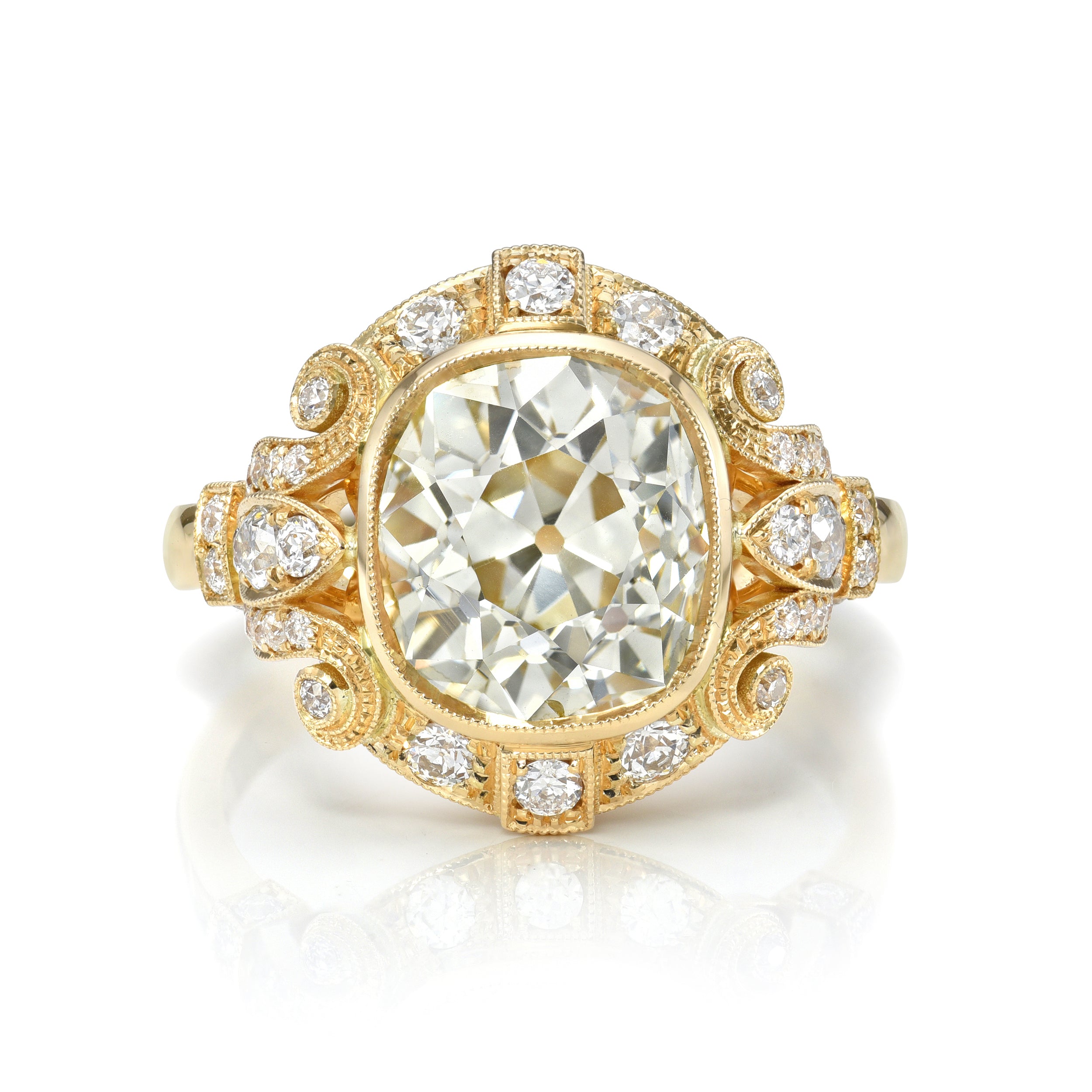 3.36ct O-P/SI1 antique cushion cut diamond with 0.46ctw old European cut accent diamonds set in a handcrafted 18K yellow gold mounting.
