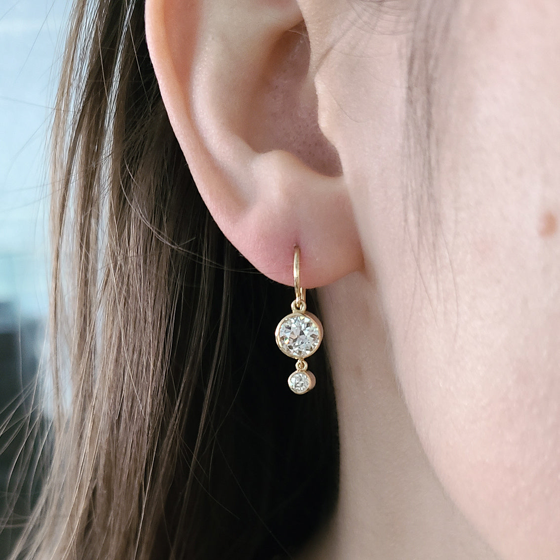 1.83ctw I-J/VVS2-VS2 GIA certified old European cut diamonds with 0.18ctw old European cut accent diamonds bezel set in handcrafted 18K yellow gold drop earrings.