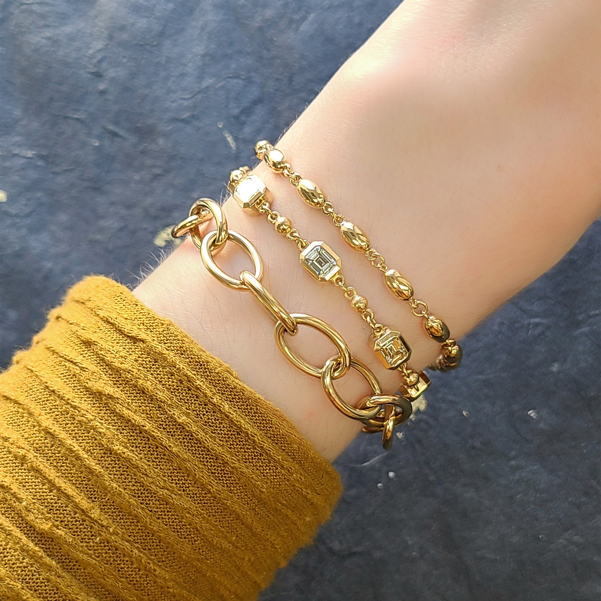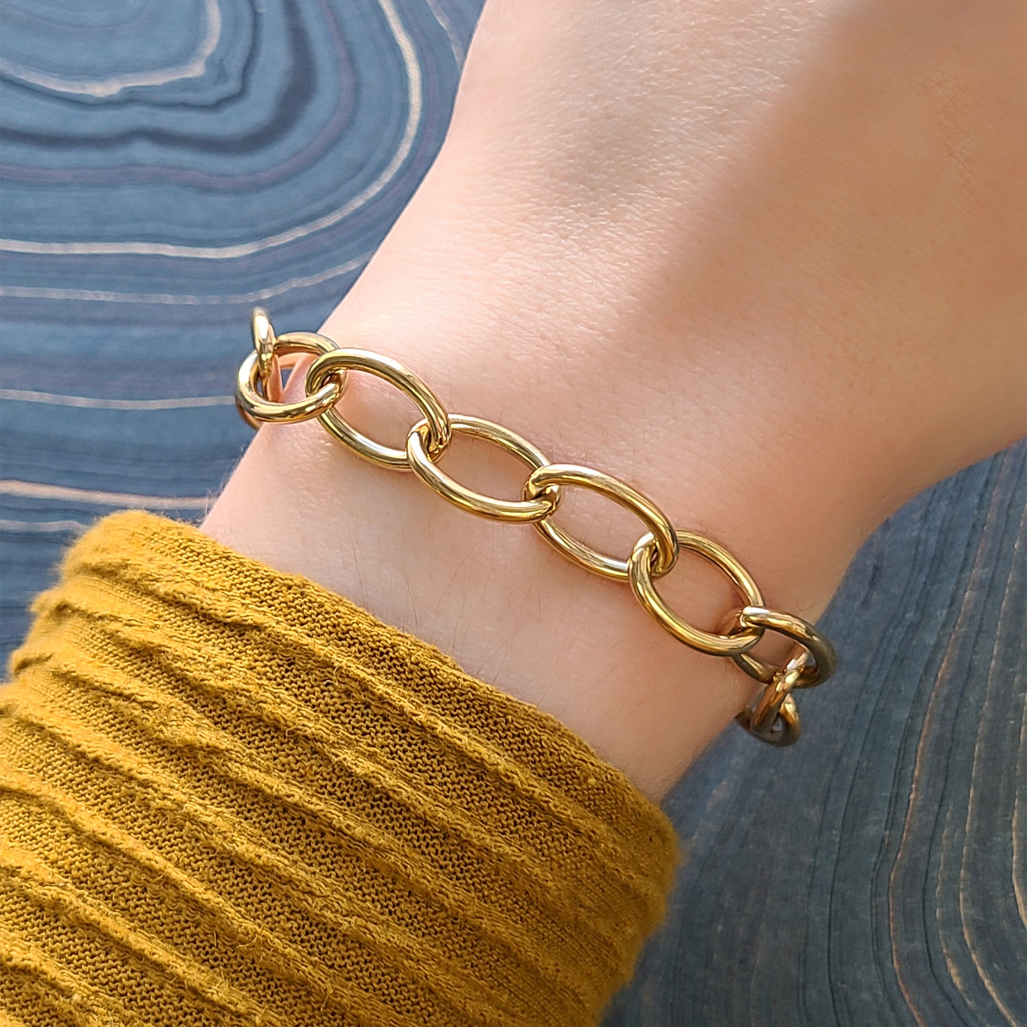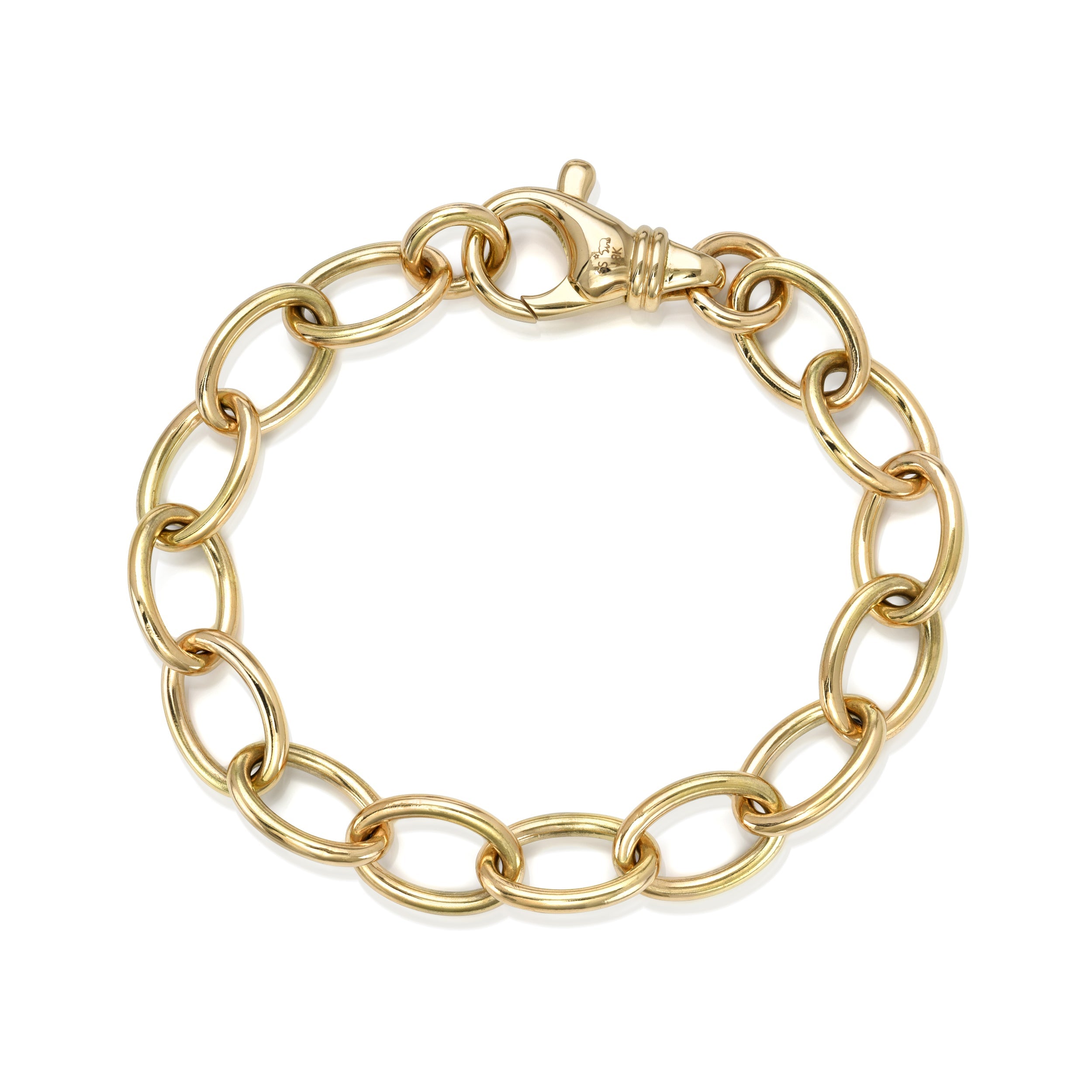 Handcrafted 18K yellow gold wide oval link bracelet.