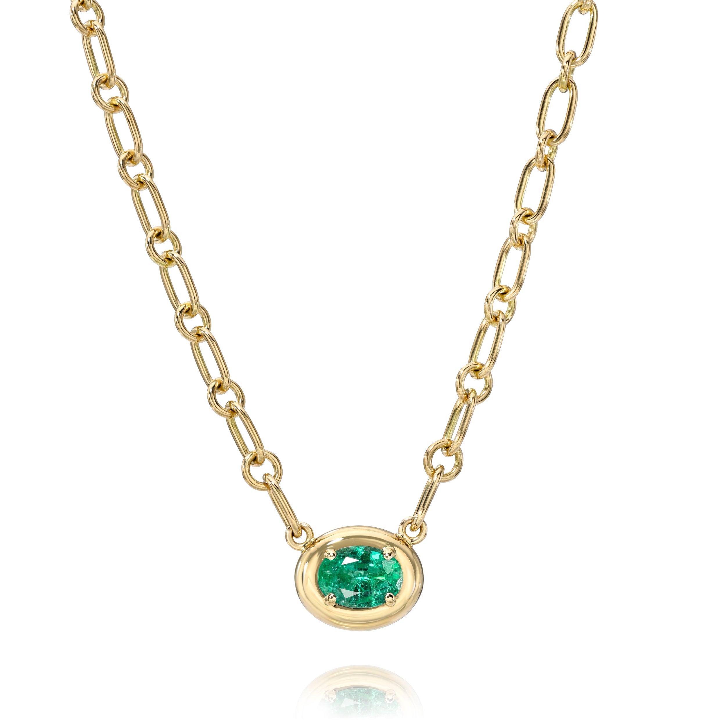 1.01ct GIA certified Zambian oval cut green emerald prong set on our handcrafted 18K yellow gold Mini Lo chain.