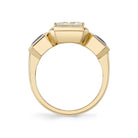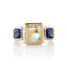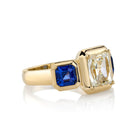 1.77ct K/VS1 GIA certified rectangular mixed cut diamond with 1.65ctw blue sapphire accent stones set in a handcrafted 18K yellow gold mounting.