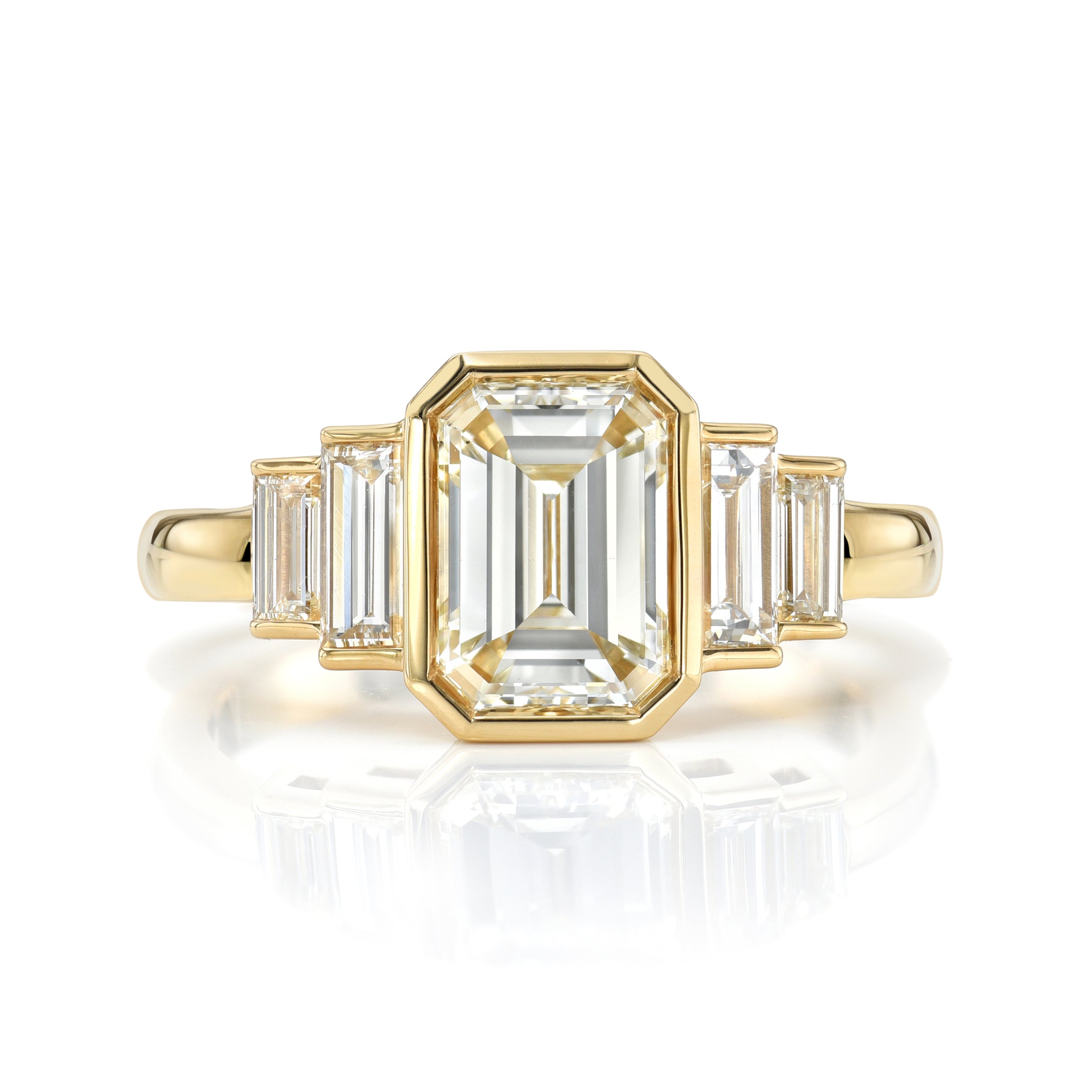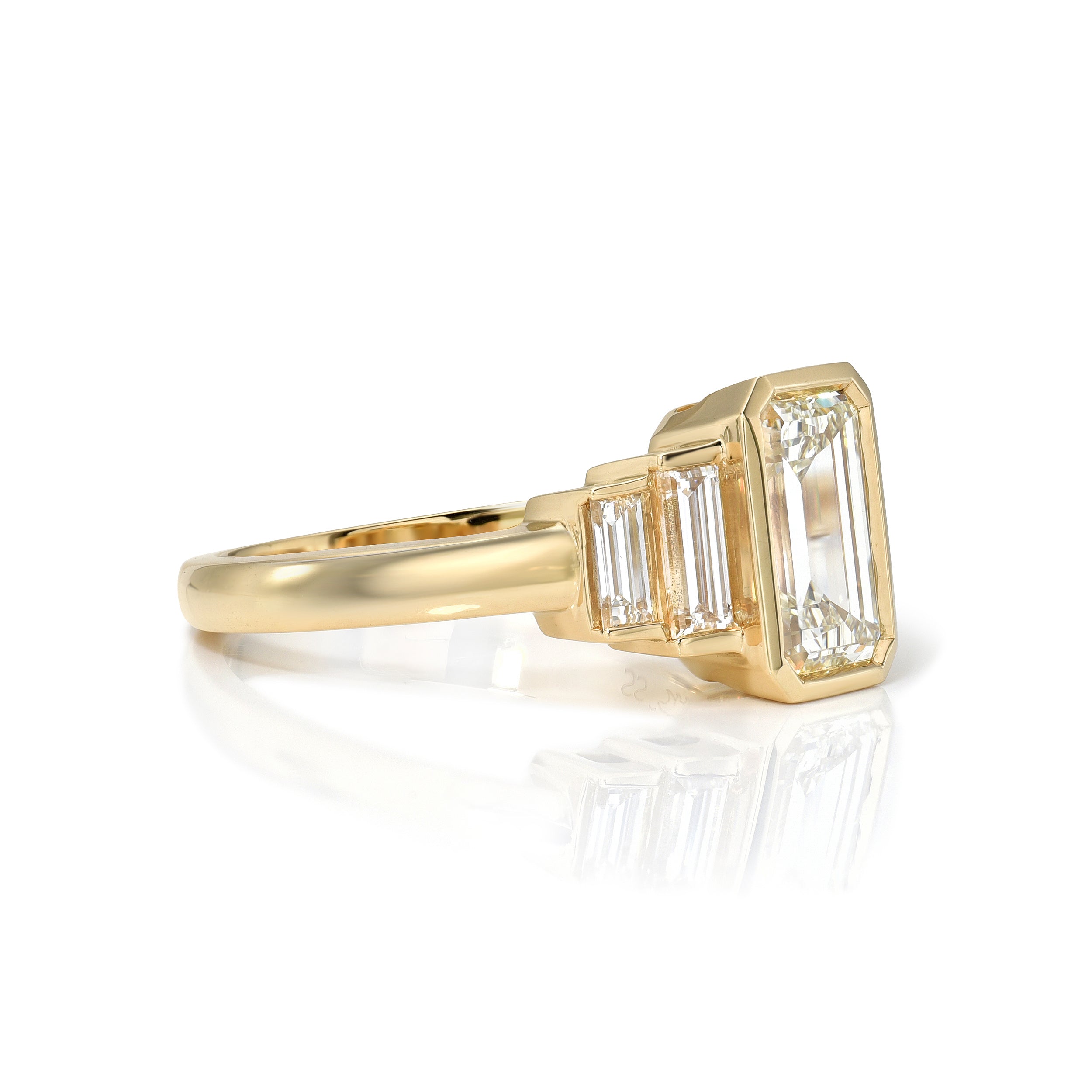 1.52ct M/VVS1 GIA certified emerald cut diamond with 0.56ctw baguette cut accent diamonds bezel set in a handcrafted 18K yellow gold mounting.