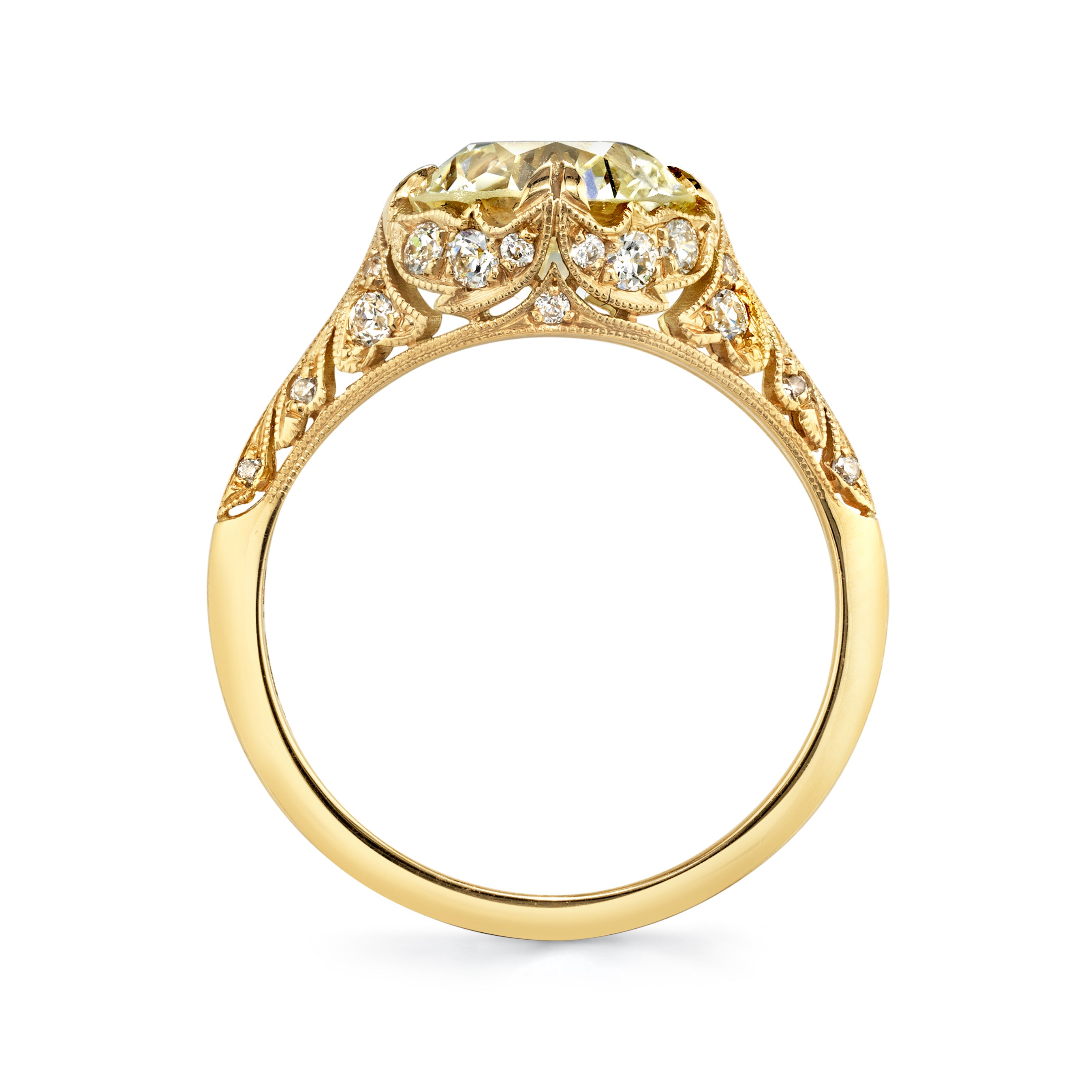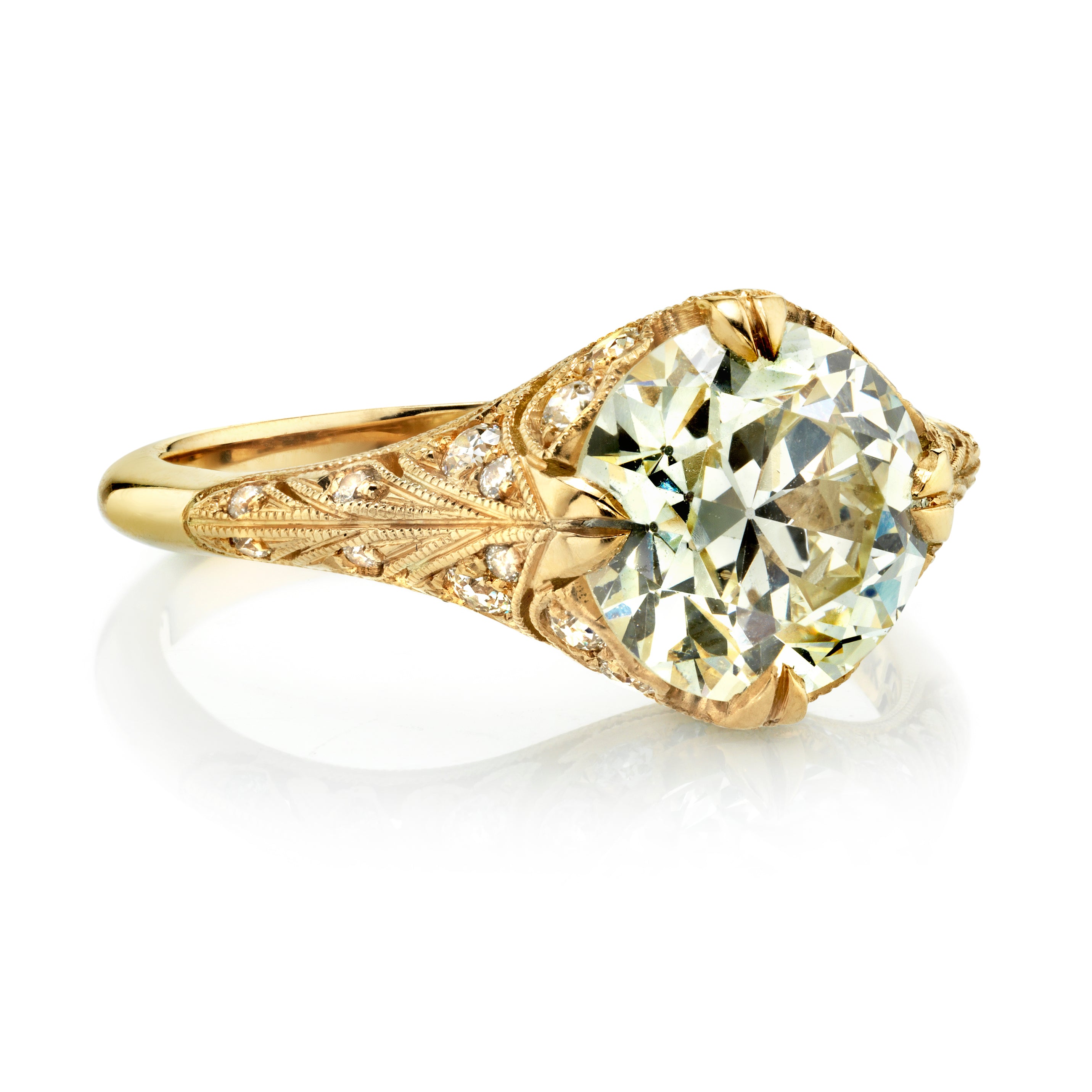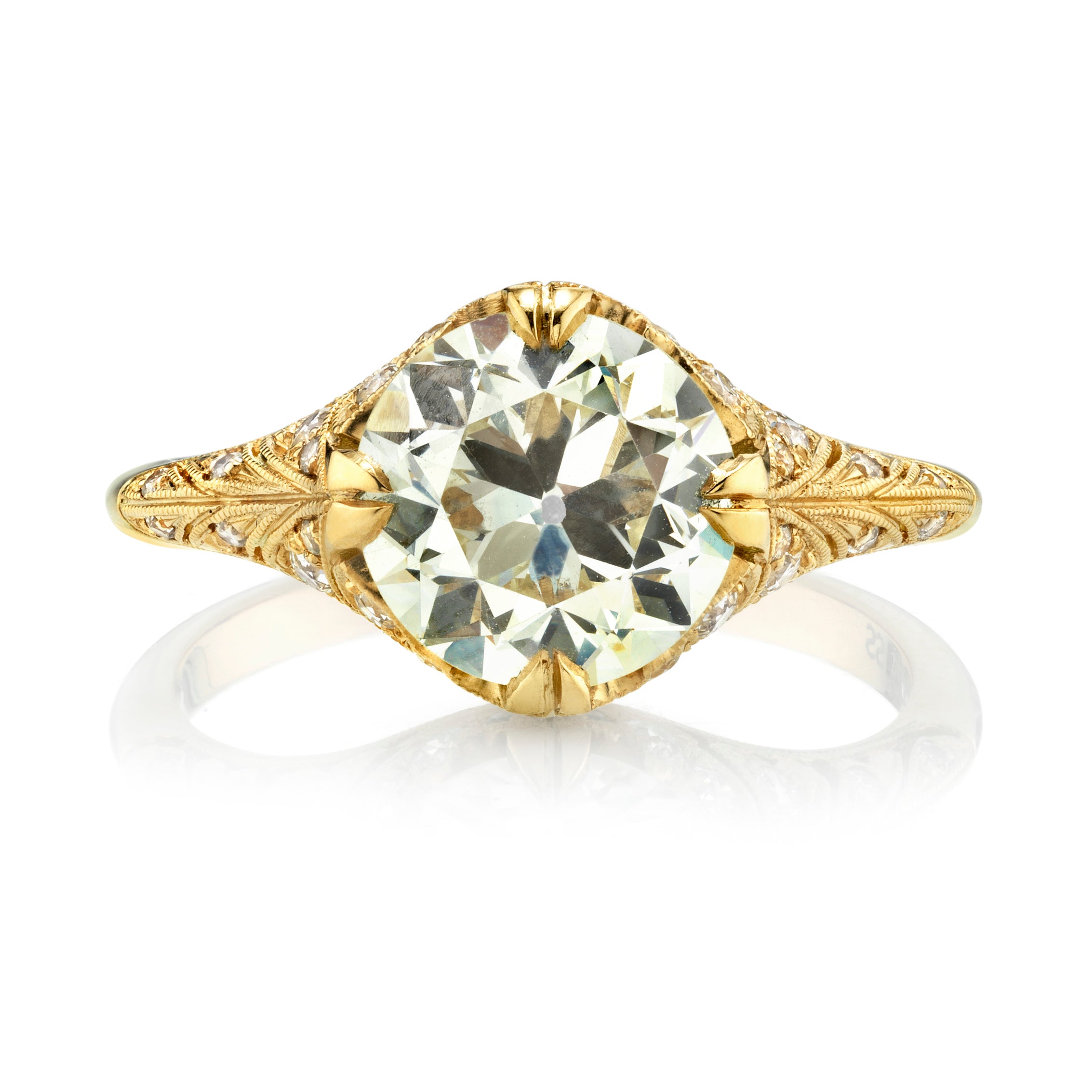 2.30ct N/VS2 GIA certified old European cut diamond with 0.27ctw old European cut accent diamonds prong set in a handcrafted 18K yellow gold mounting.