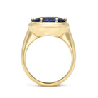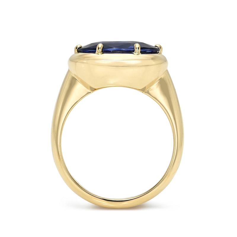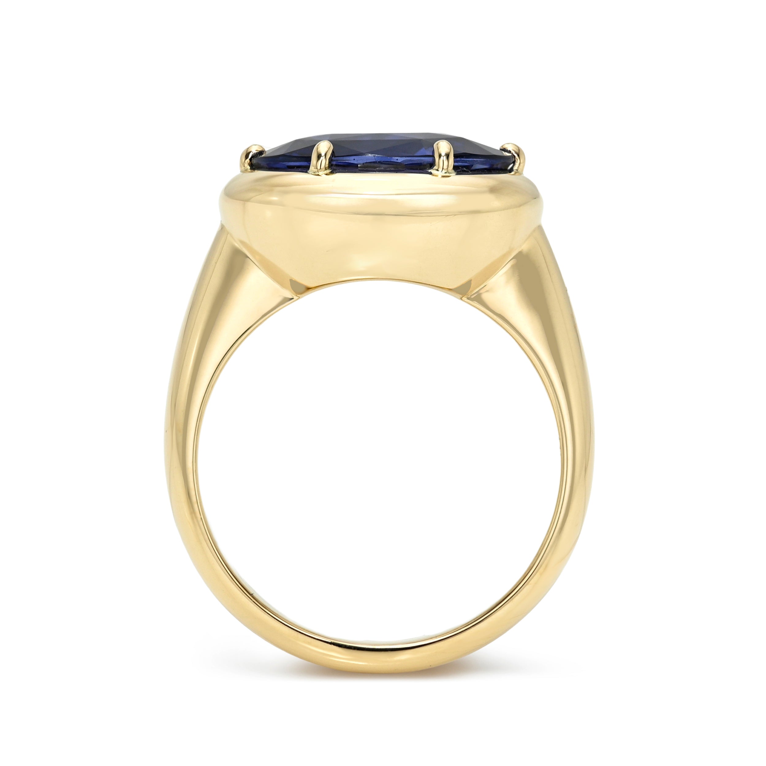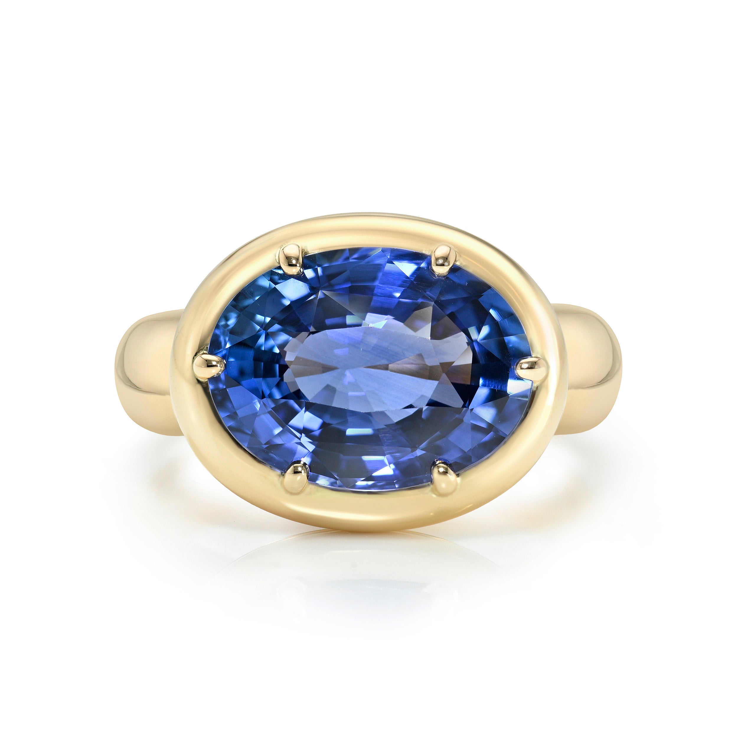 5.34ct GIA certified oval cut blue sapphire prong set in a handcrafted 18K yellow gold mounting.