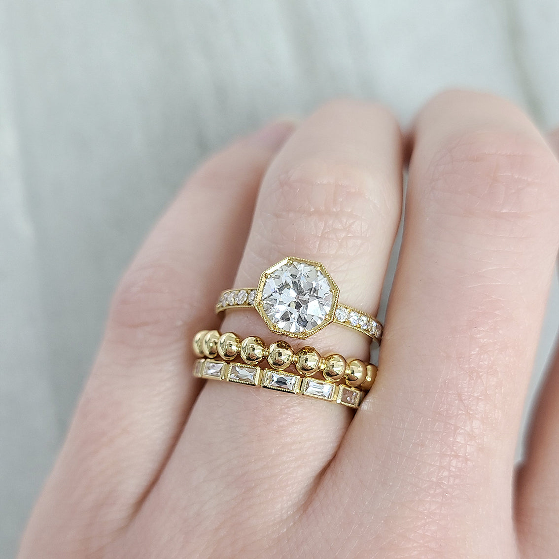 The 19th century brought about techniques that advanced the diamond cutting industry and thus, the old European cut diamond was born. With 58 facets, a small table, high crown angle, circular shape, and open culet, the old European cut diamond became the precursor to the modern round diamonds that we see today. Our vintage old European cut diamonds, cut primarily in the 1920s and 1930s, are used in many of our designs, from larger center stones to small, pave set diamonds.