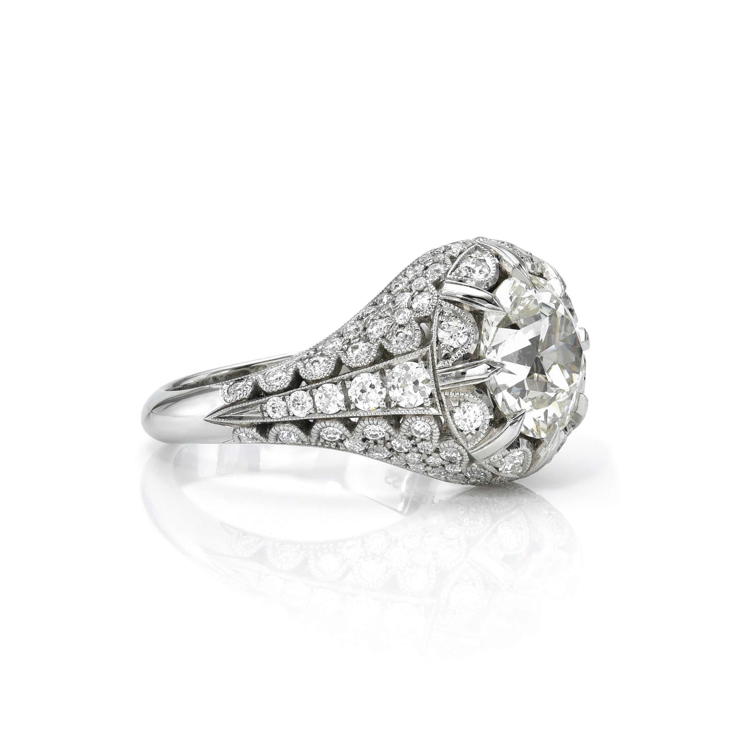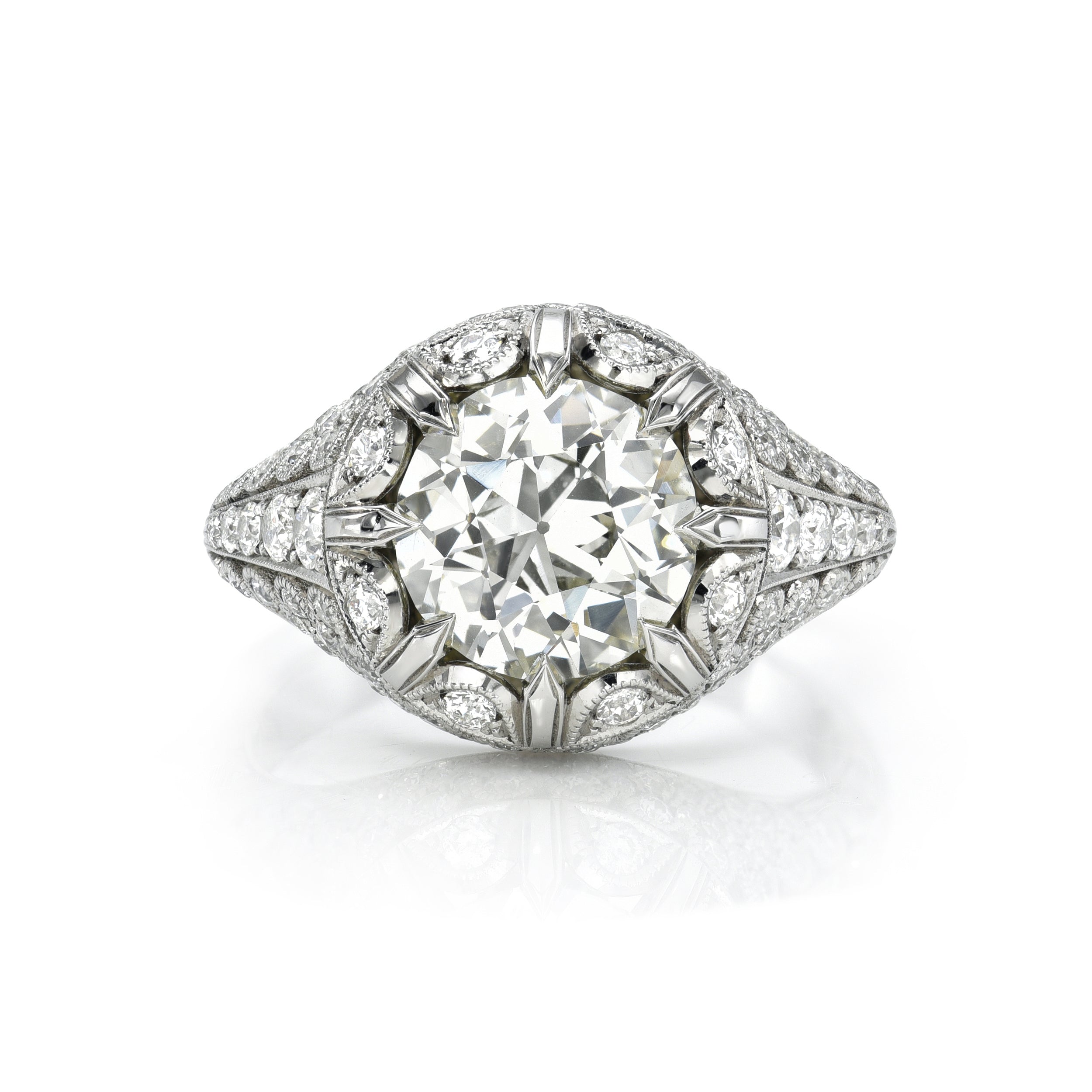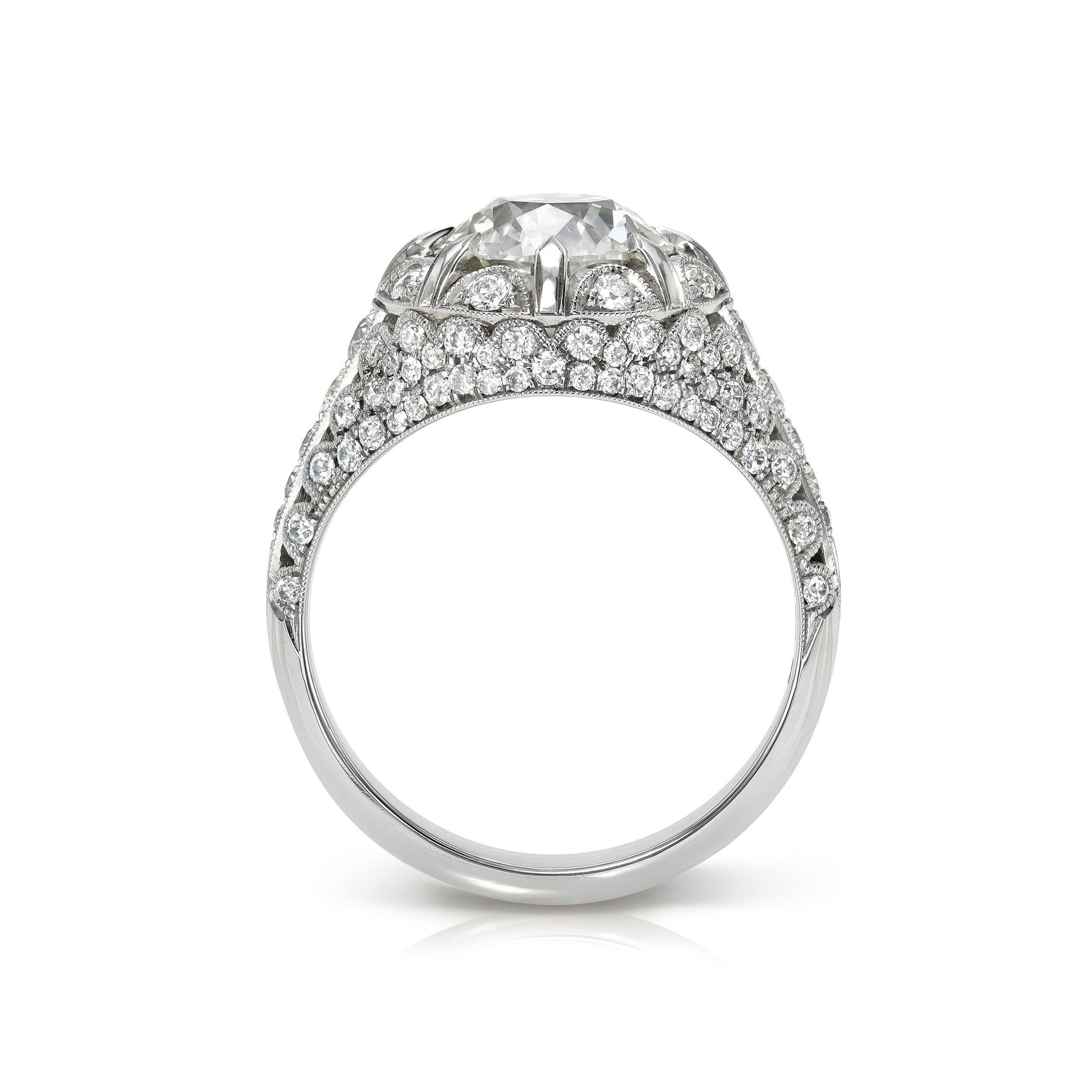 2.29ct M/VS2 GIA certified old European cut diamond with 0.87ctw old European cut accent diamonds prong set in a handcrafted platinum mounting.
