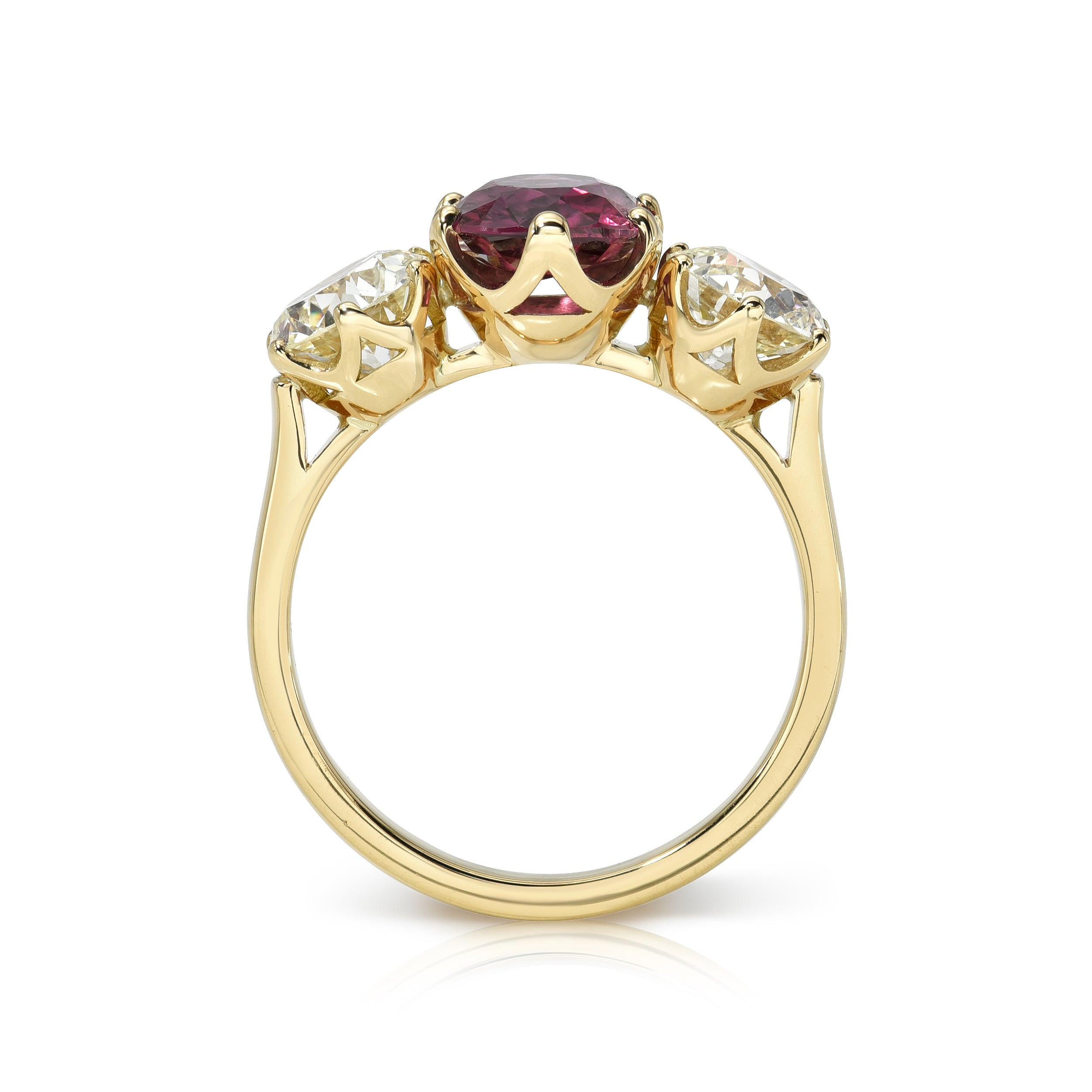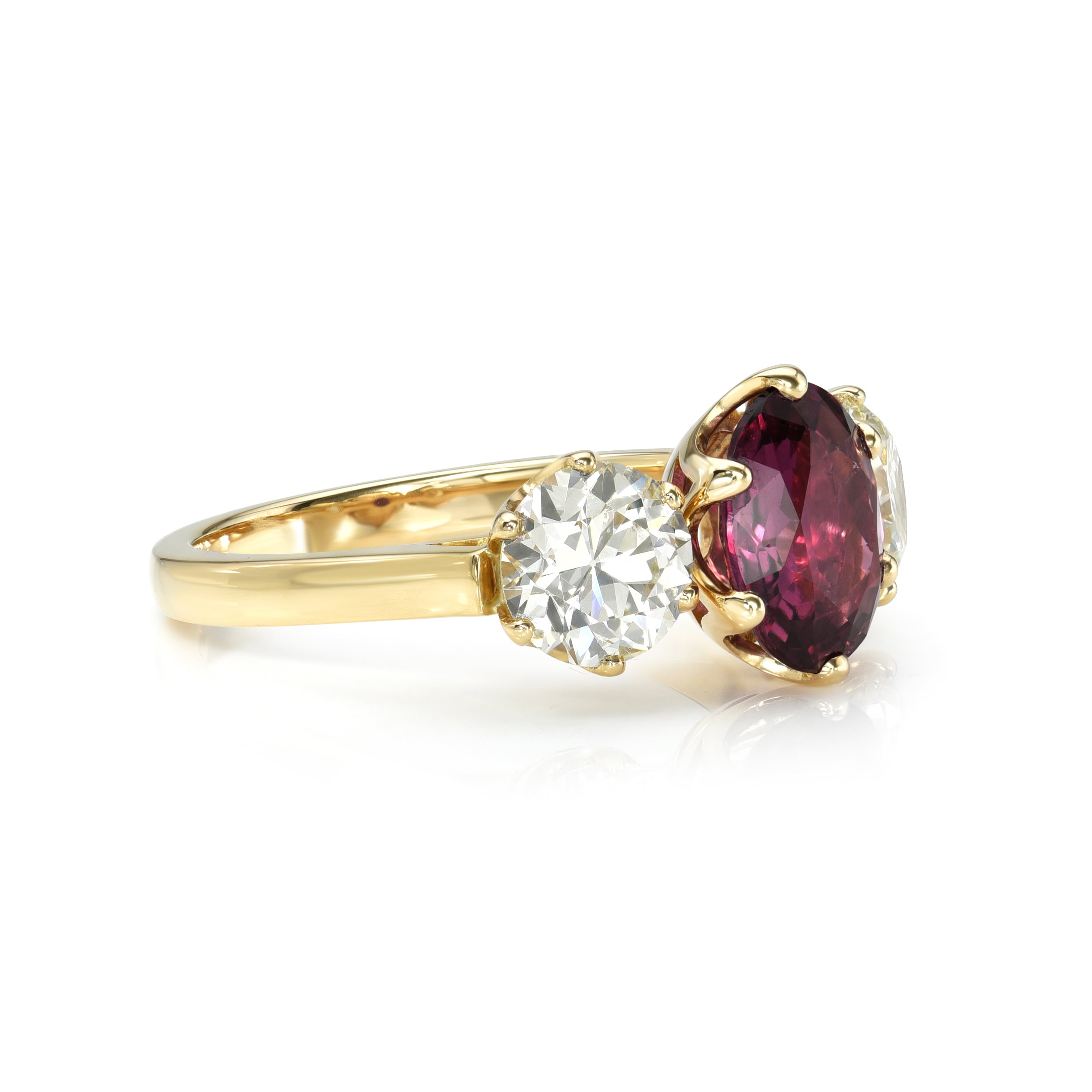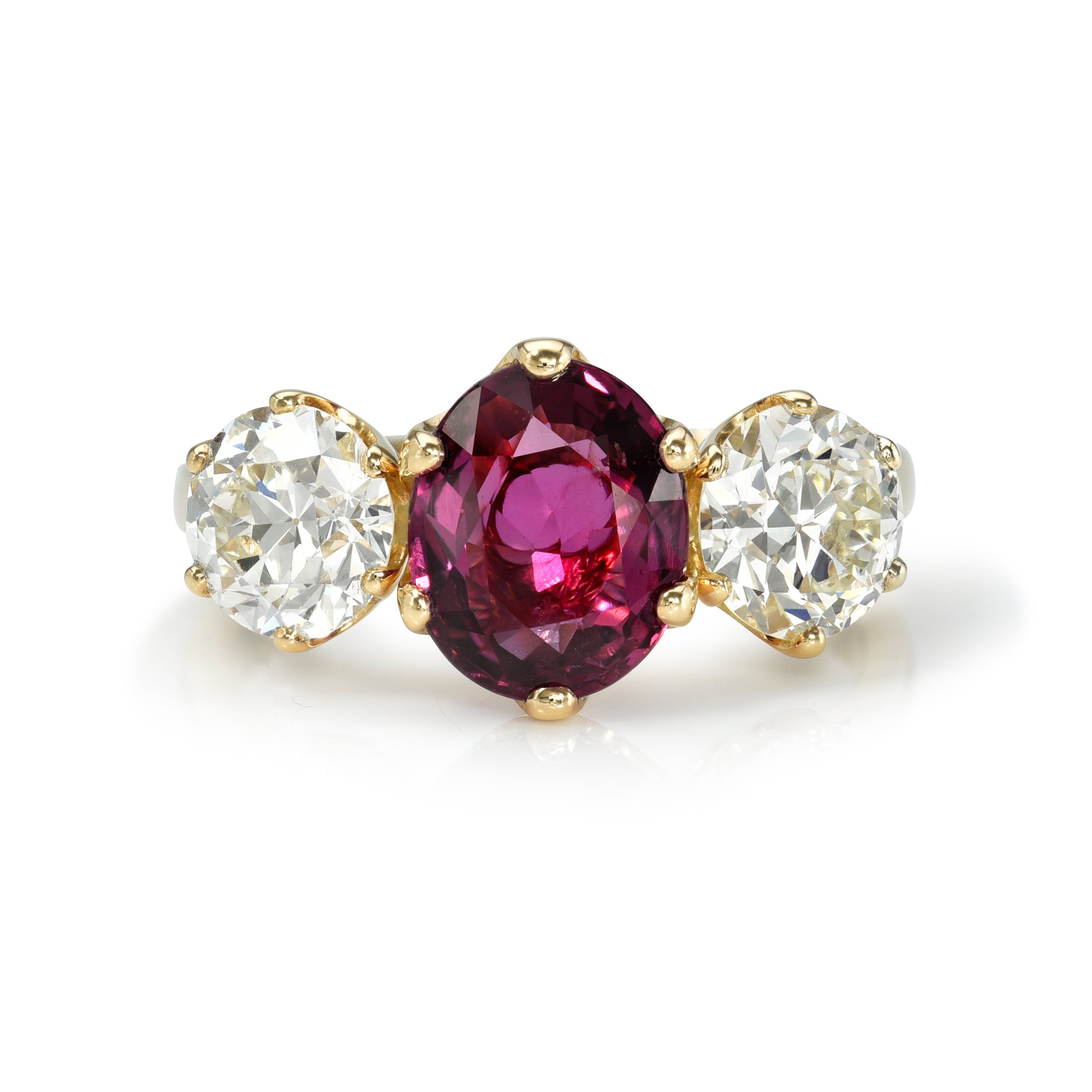 1.83ct oval cut ruby with 1.59ctw L-M/VS1-VS2 GIA certified old European cut accent diamonds prong set in a handcrafted 18K yellow gold mounting.