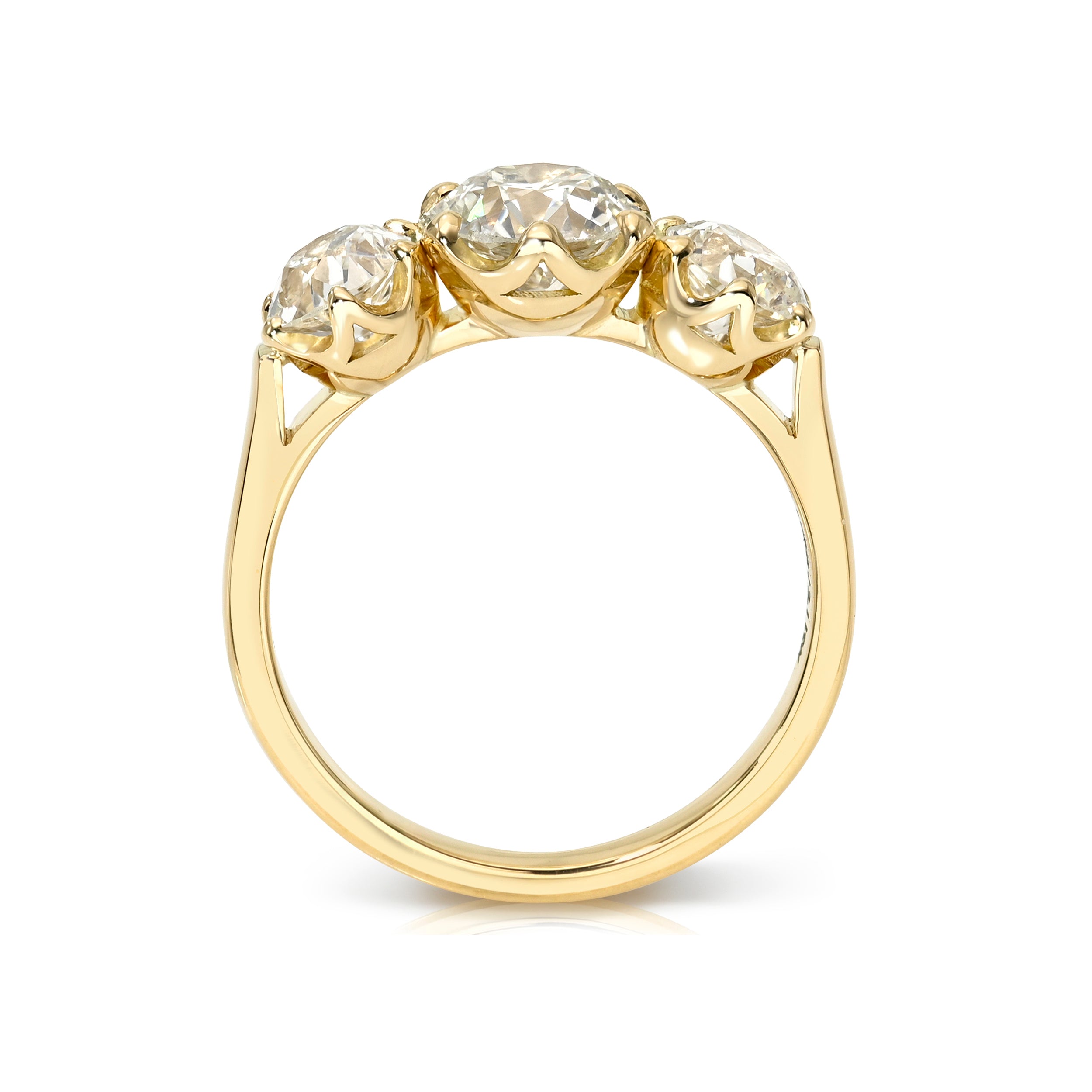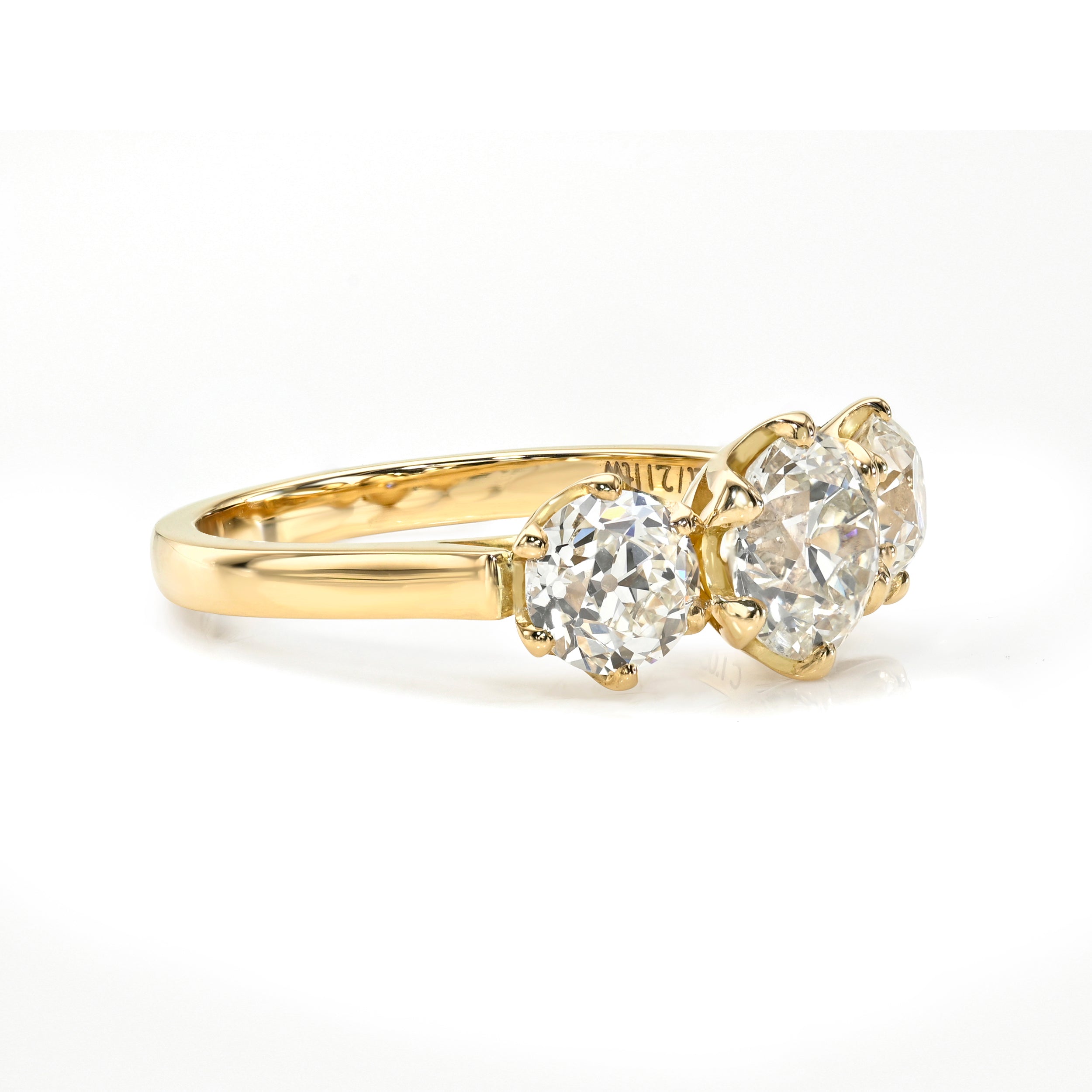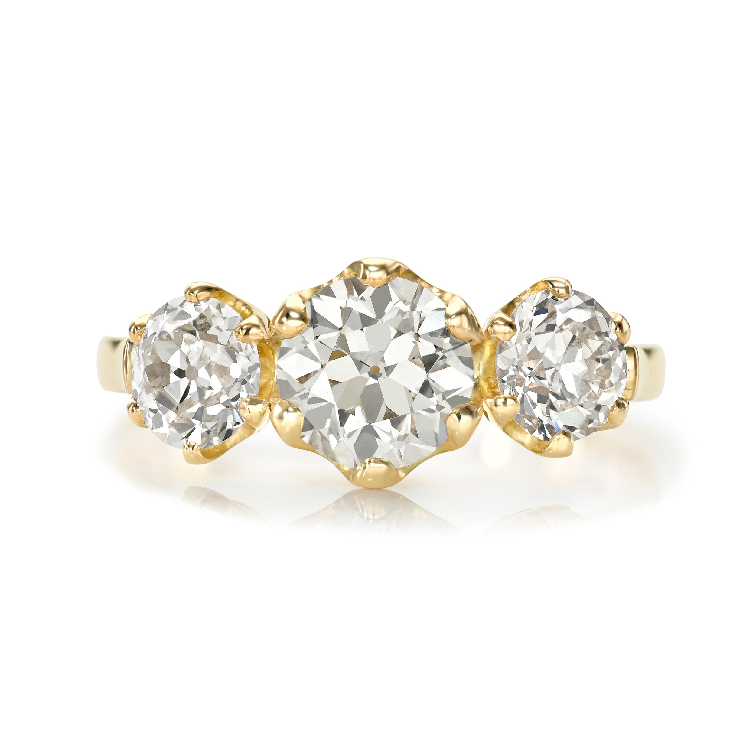 1.05ct K/I1 GIA certified old European cut diamond flanked by 1.06ctw J/VS2-SI2 GIA certified old european cut accent diamonds prong set in a handcrafted 18K yellow gold mounting.