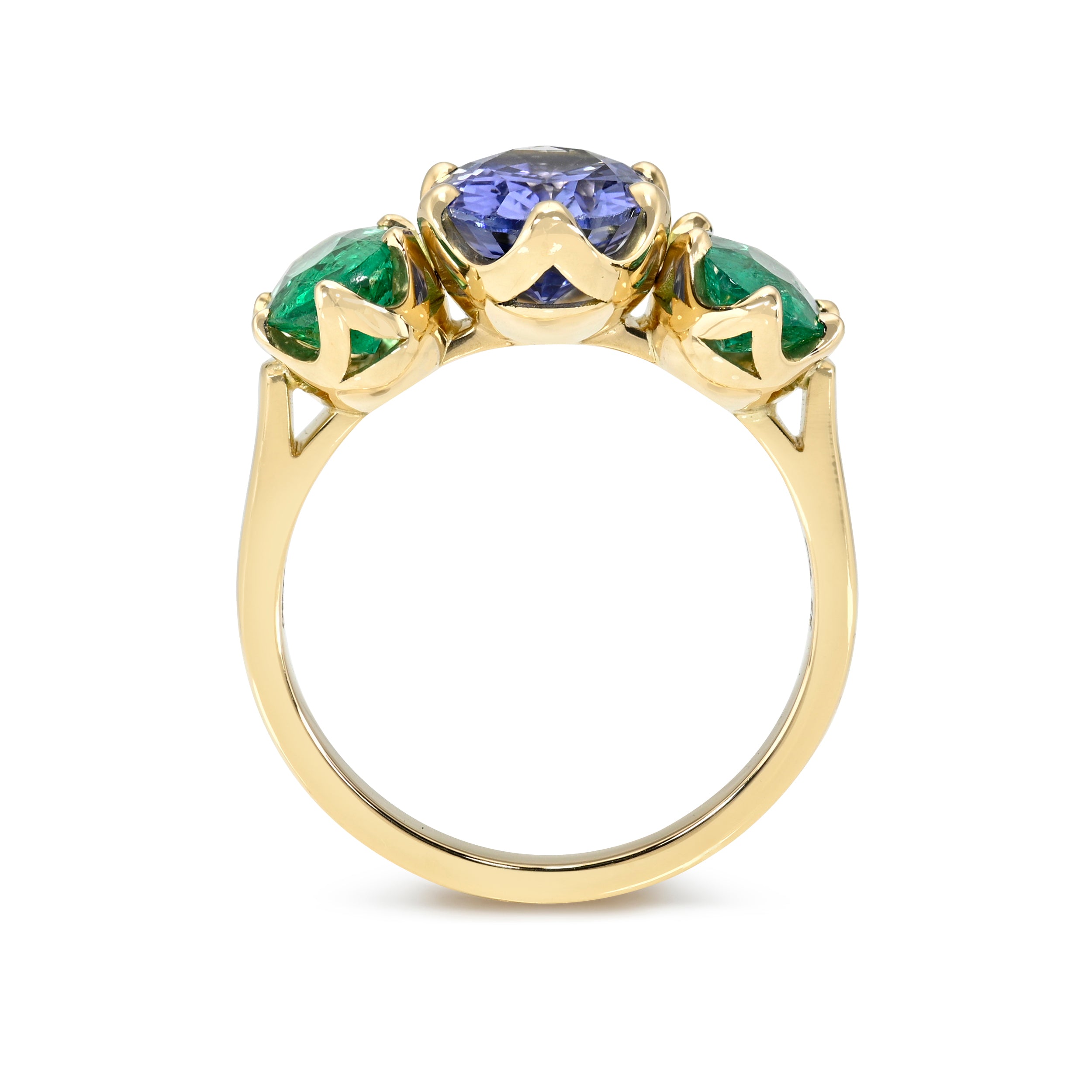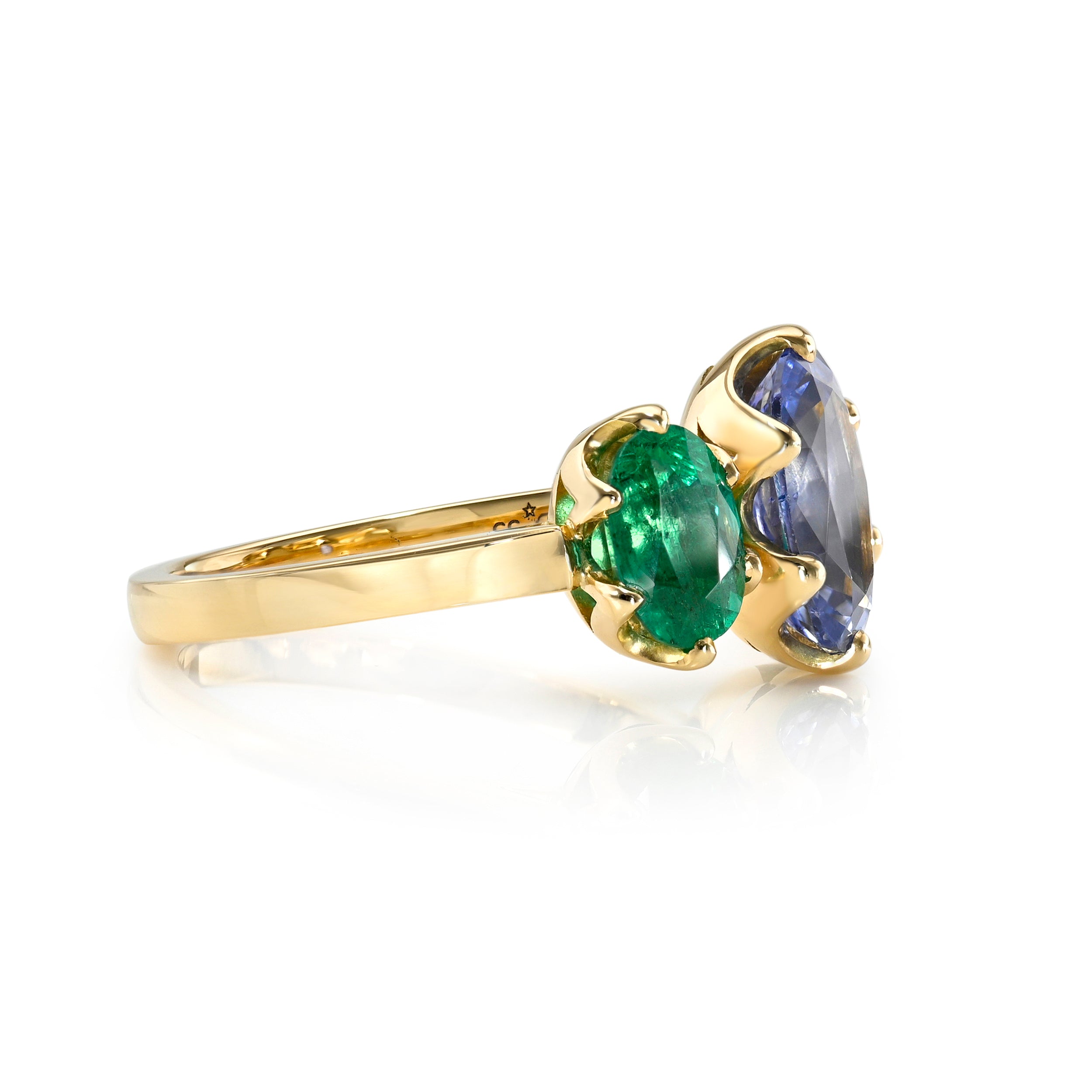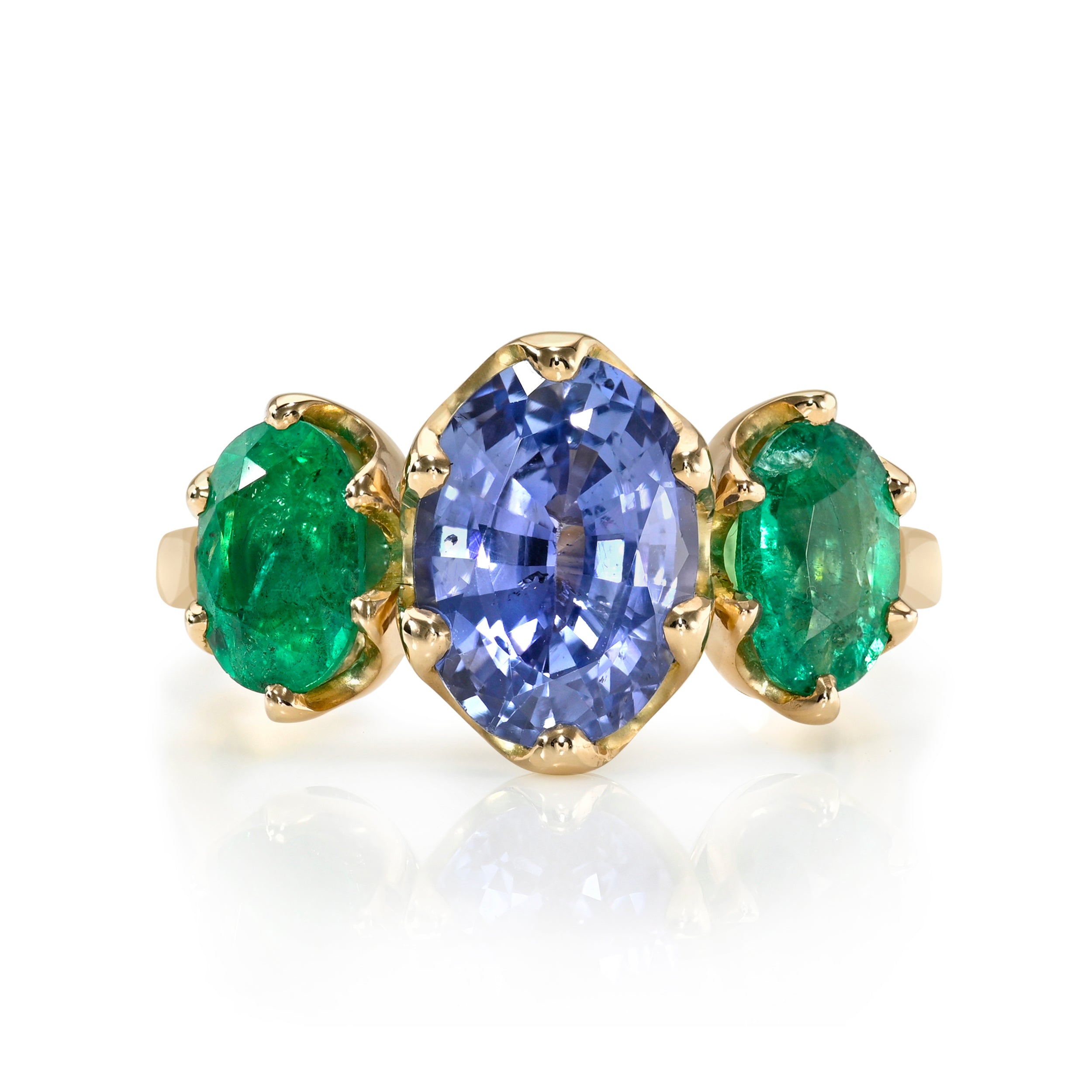 2.49ct GIA certified Sri Lankan oval cut blue sapphire flanked by 1.44ctw oval cut green emerald accents prong set in a handcrafted 18K yellow gold mounting.