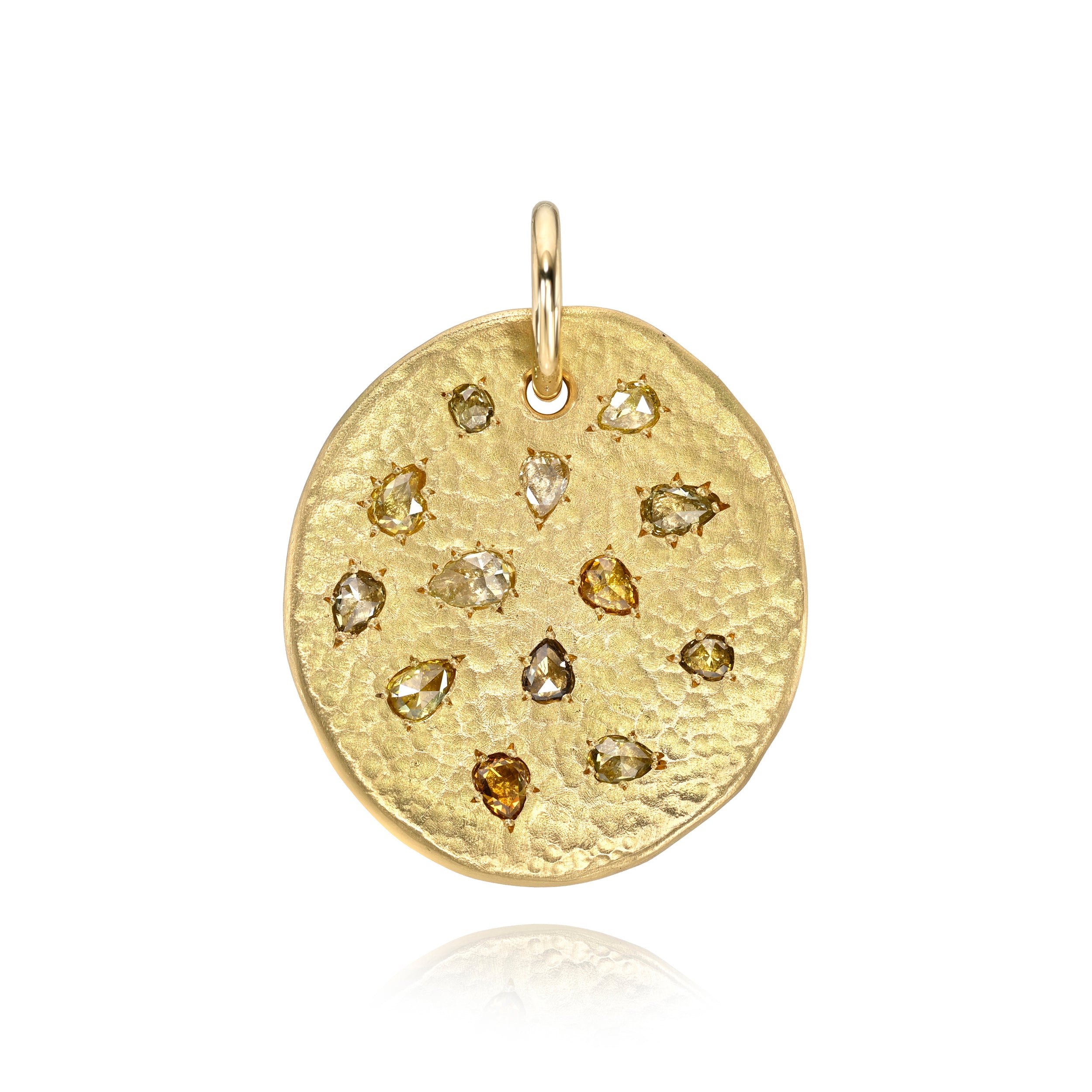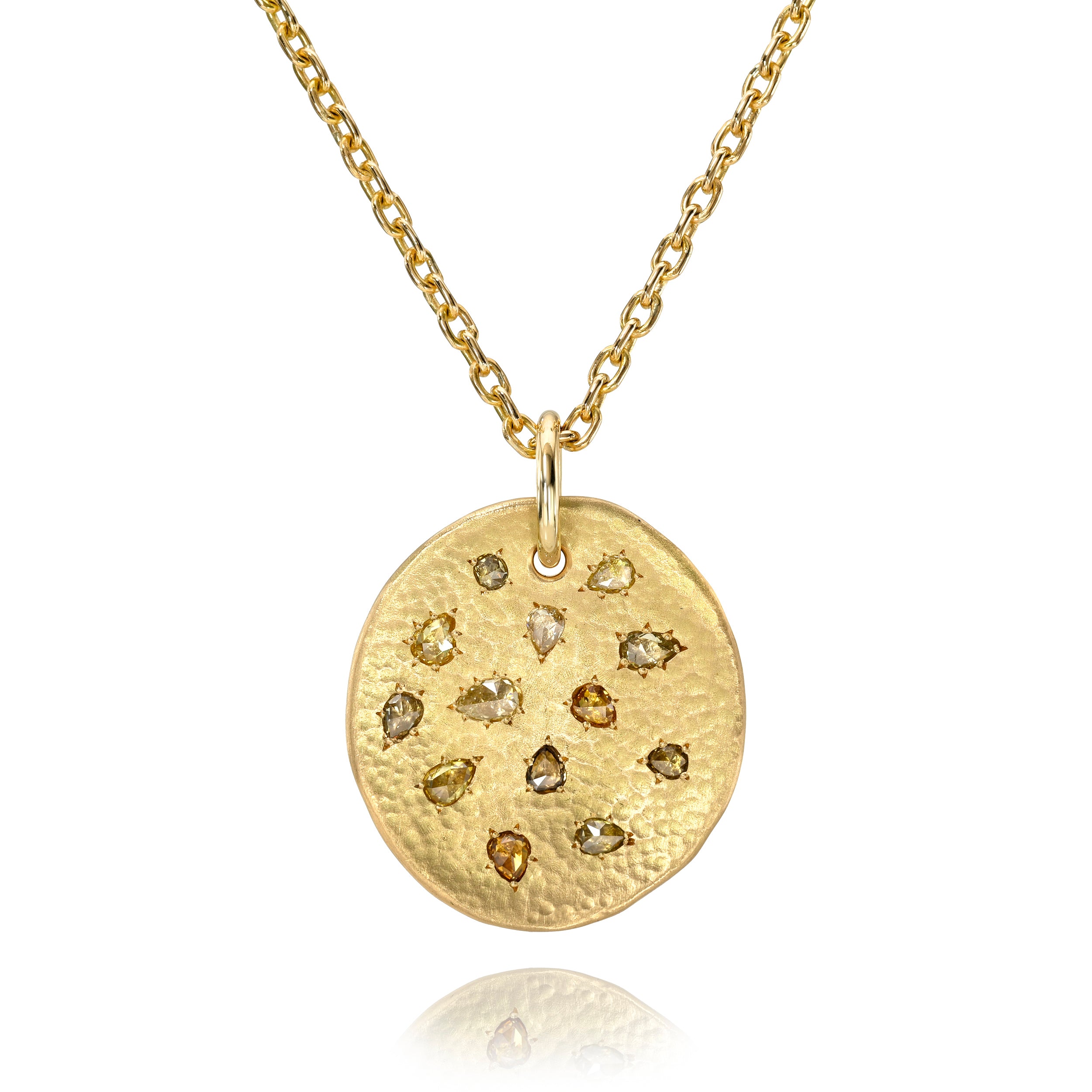 Handcrafted 18K yellow gold hammer finish medallion pendant featuring 1.62ctw pear shape natural diamonds.