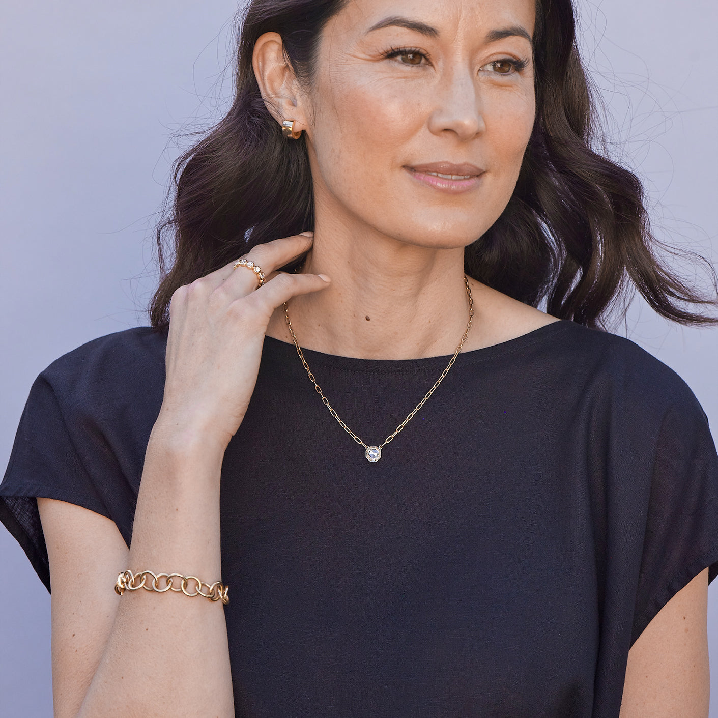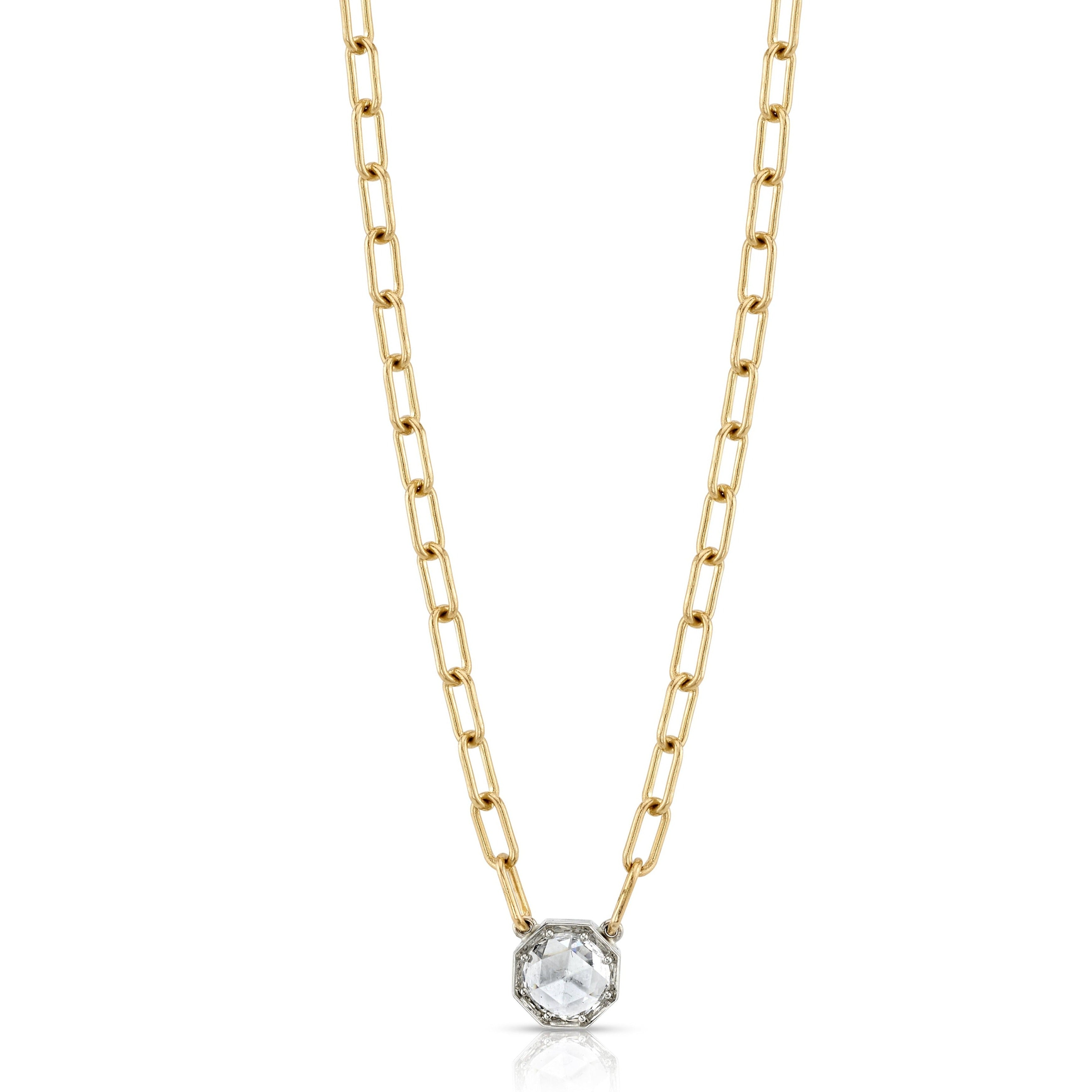 0.78ct F/VS1 GIA certified round rose cut diamond prong set in an 18K champagne white gold pendant on our handcrafted 18K yellow gold Bond chain.
