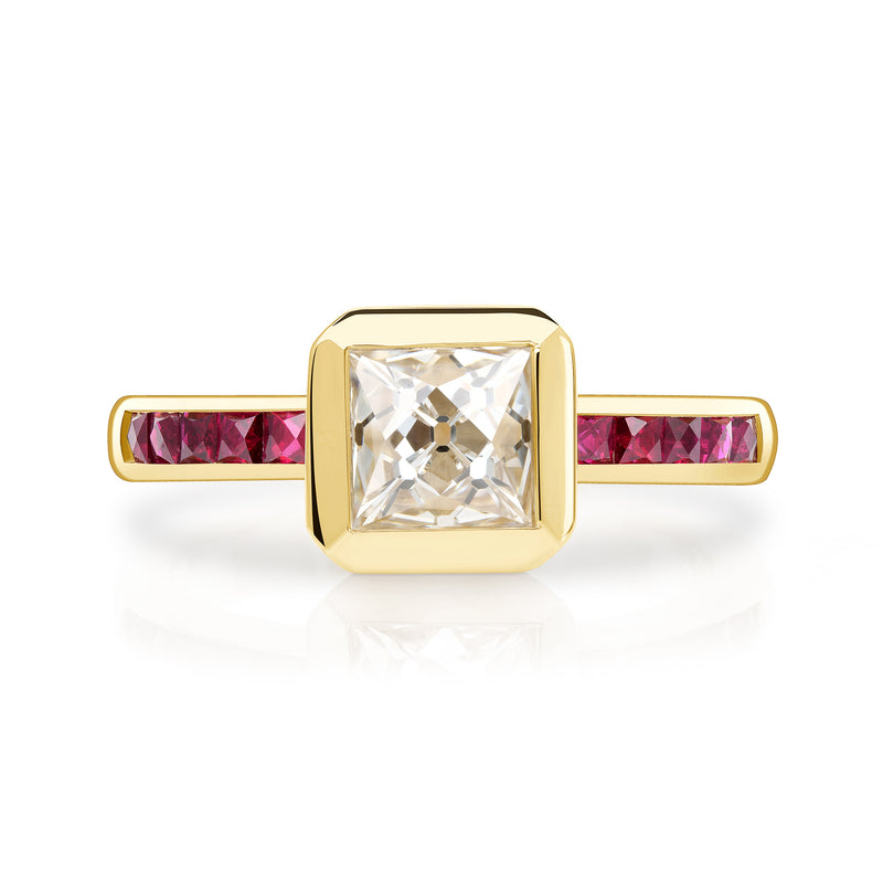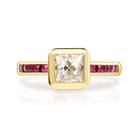 1.16ct G/VS2 GIA certified French cut diamond with 0.42ctw French cut ruby accent stones bezel set in a handcrafted 18K yellow gold mounting.