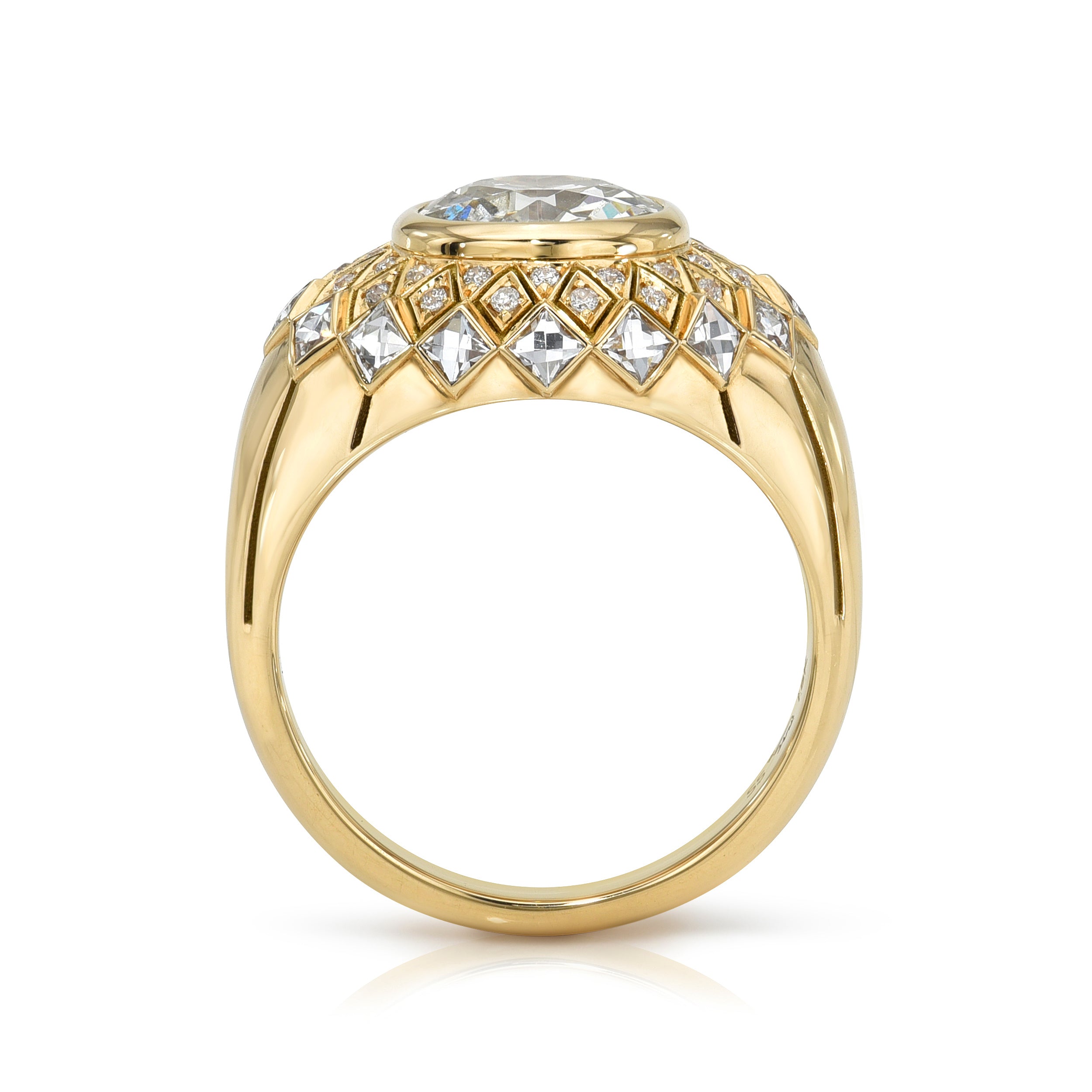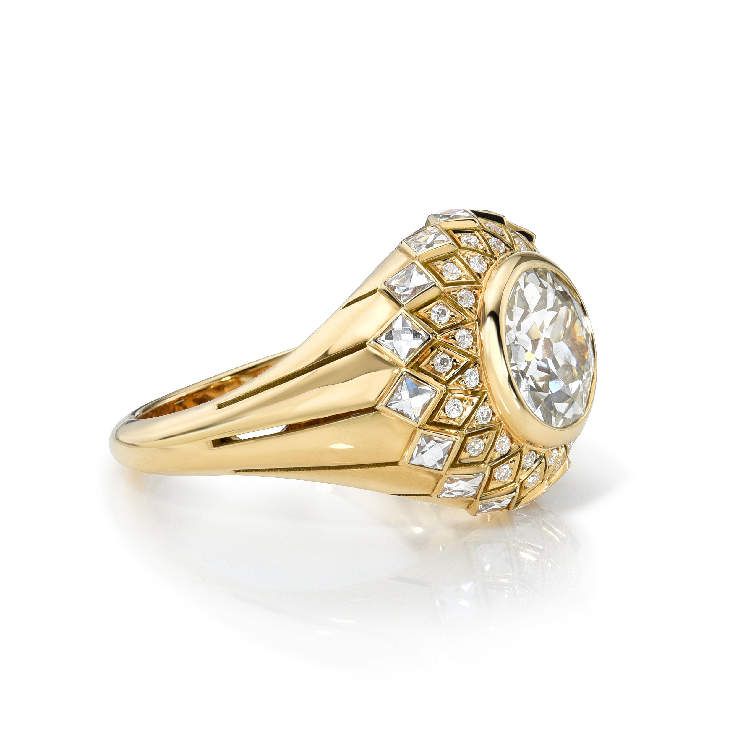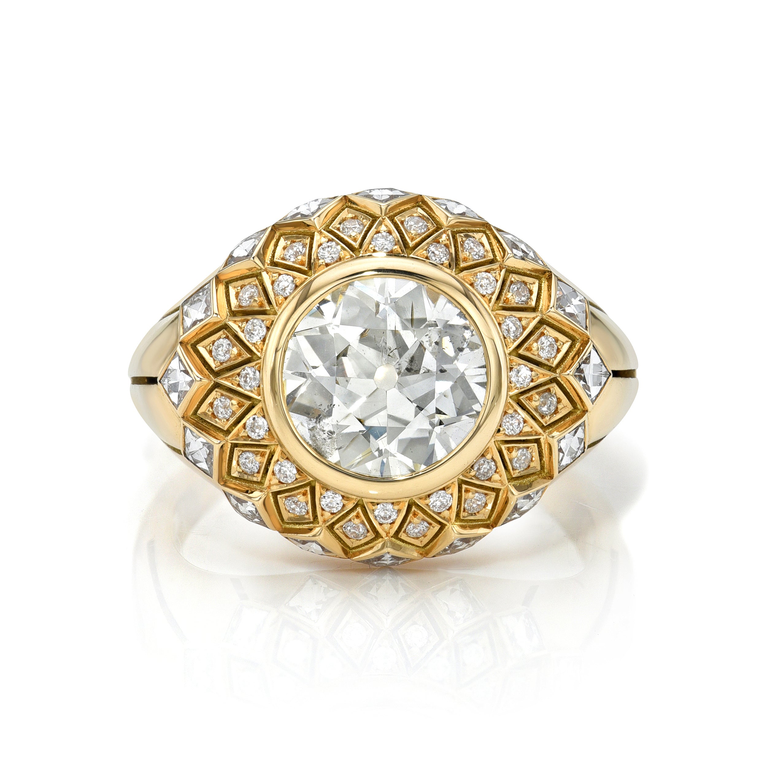 1.87ct L/SI2 GIA certified old European cut diamond with 0.59ctw mixed cut accent diamonds set in a handcrafted 18K yellow gold mounting.