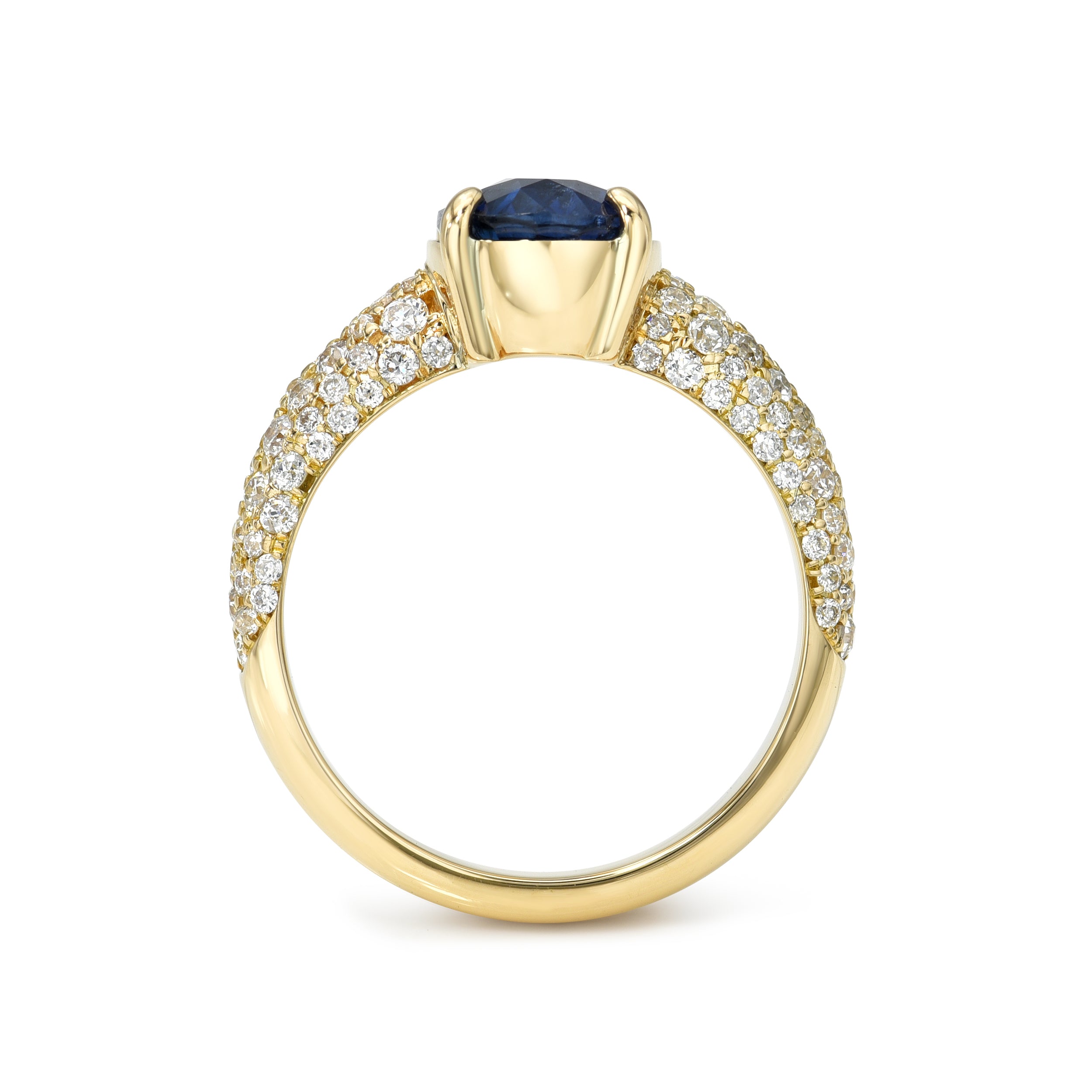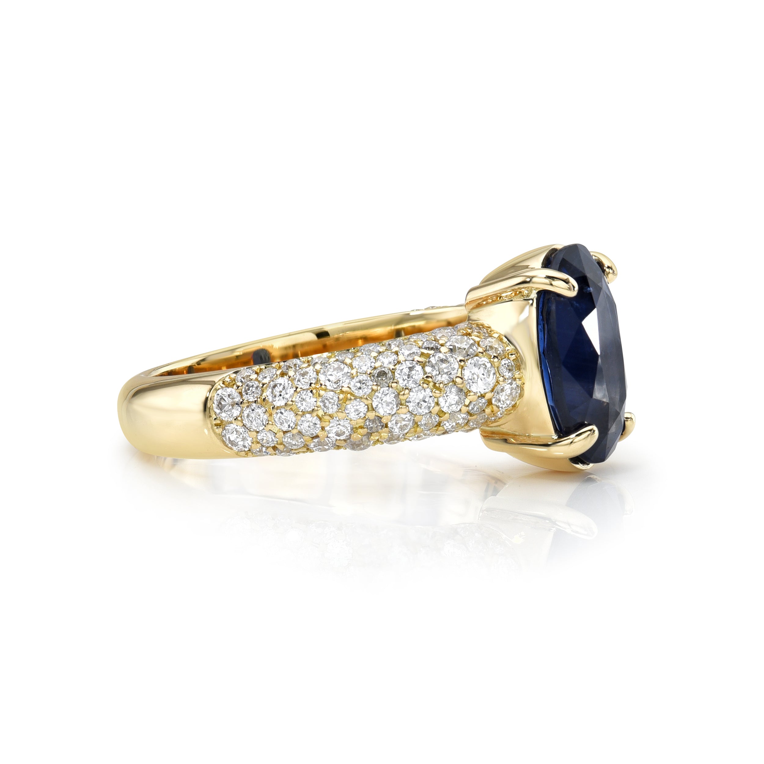 3.07ct GIA certified Sri Lankan oval cut blue sapphire with 0.84ctw old European cut accent diamonds prong set in a handcrafted 18K yellow gold mounting.