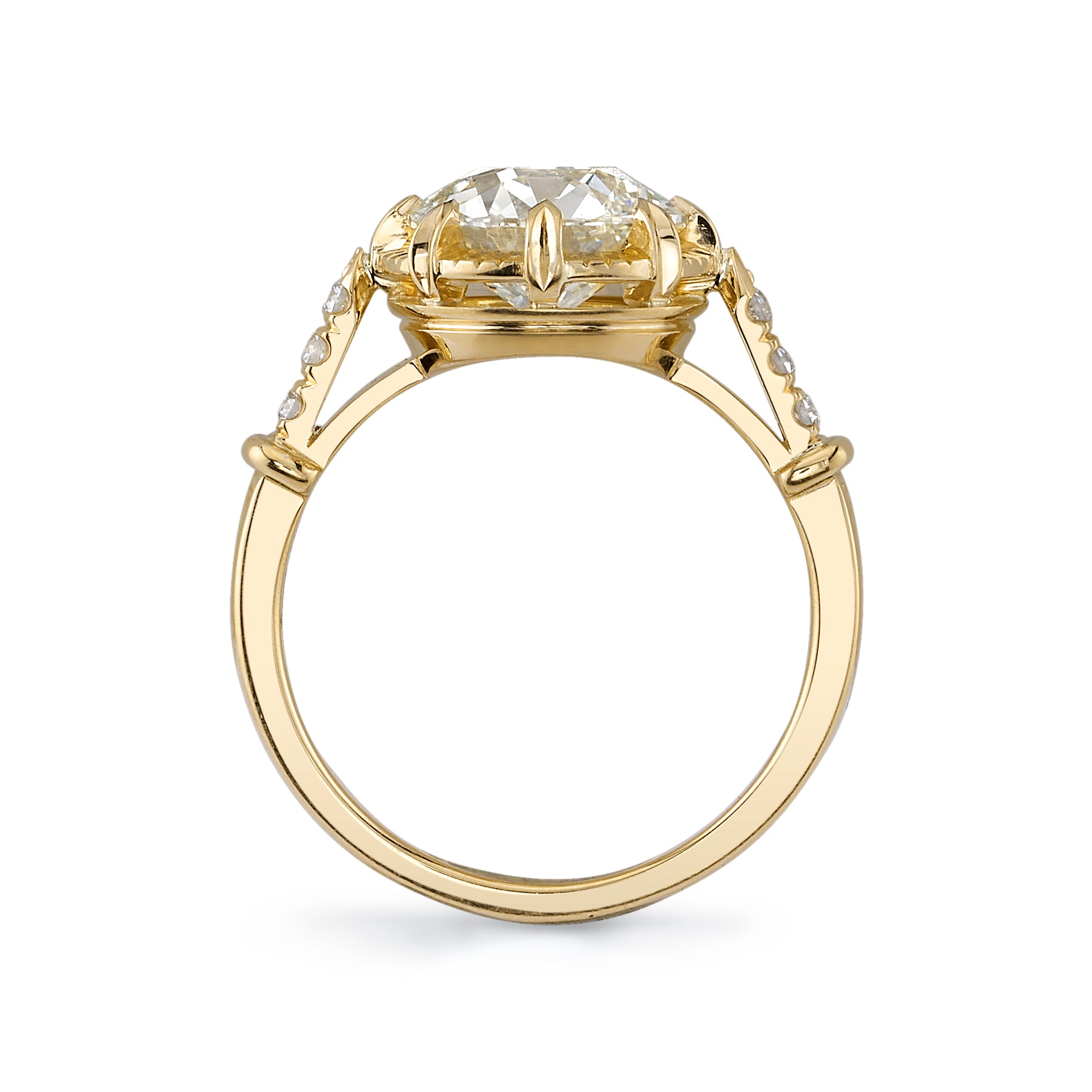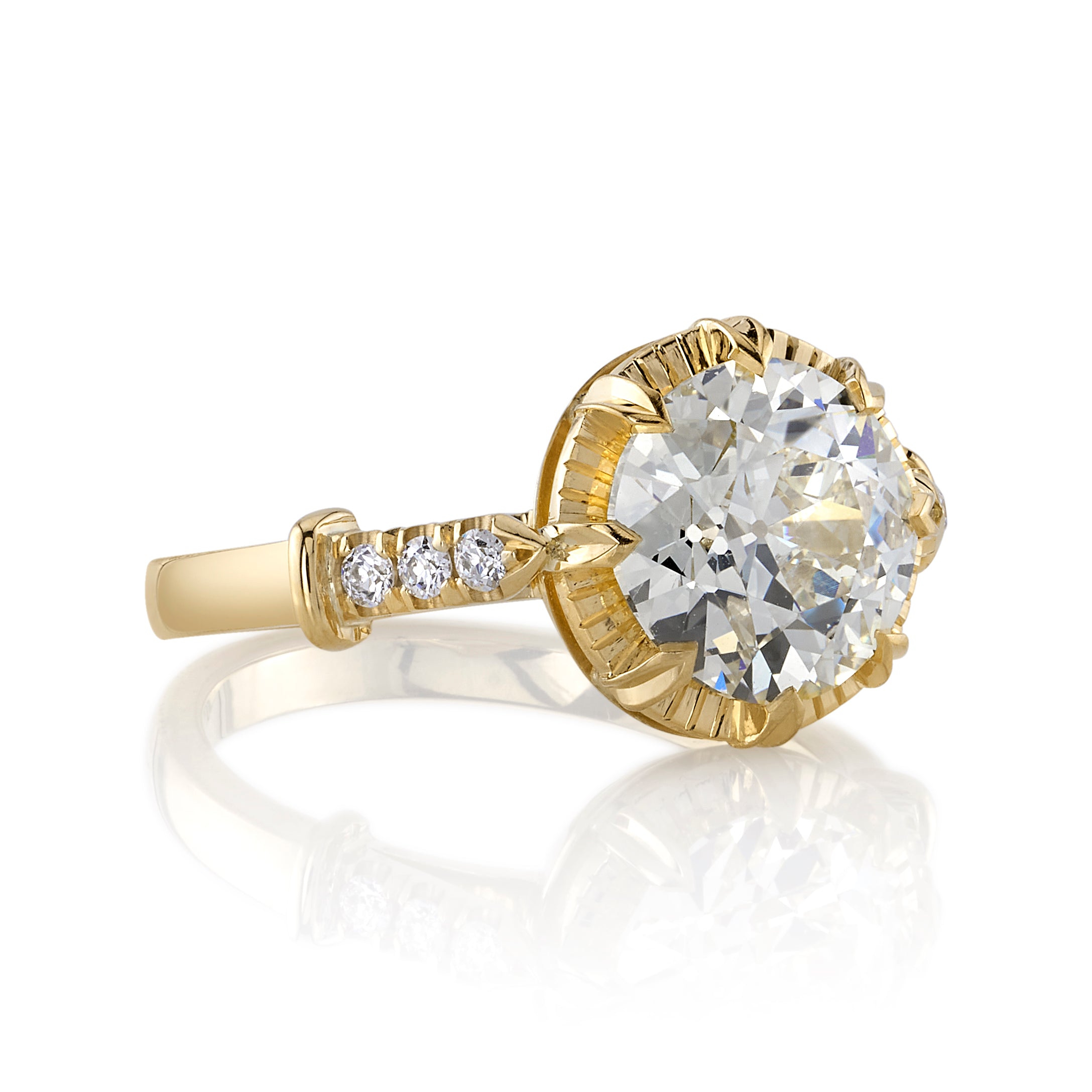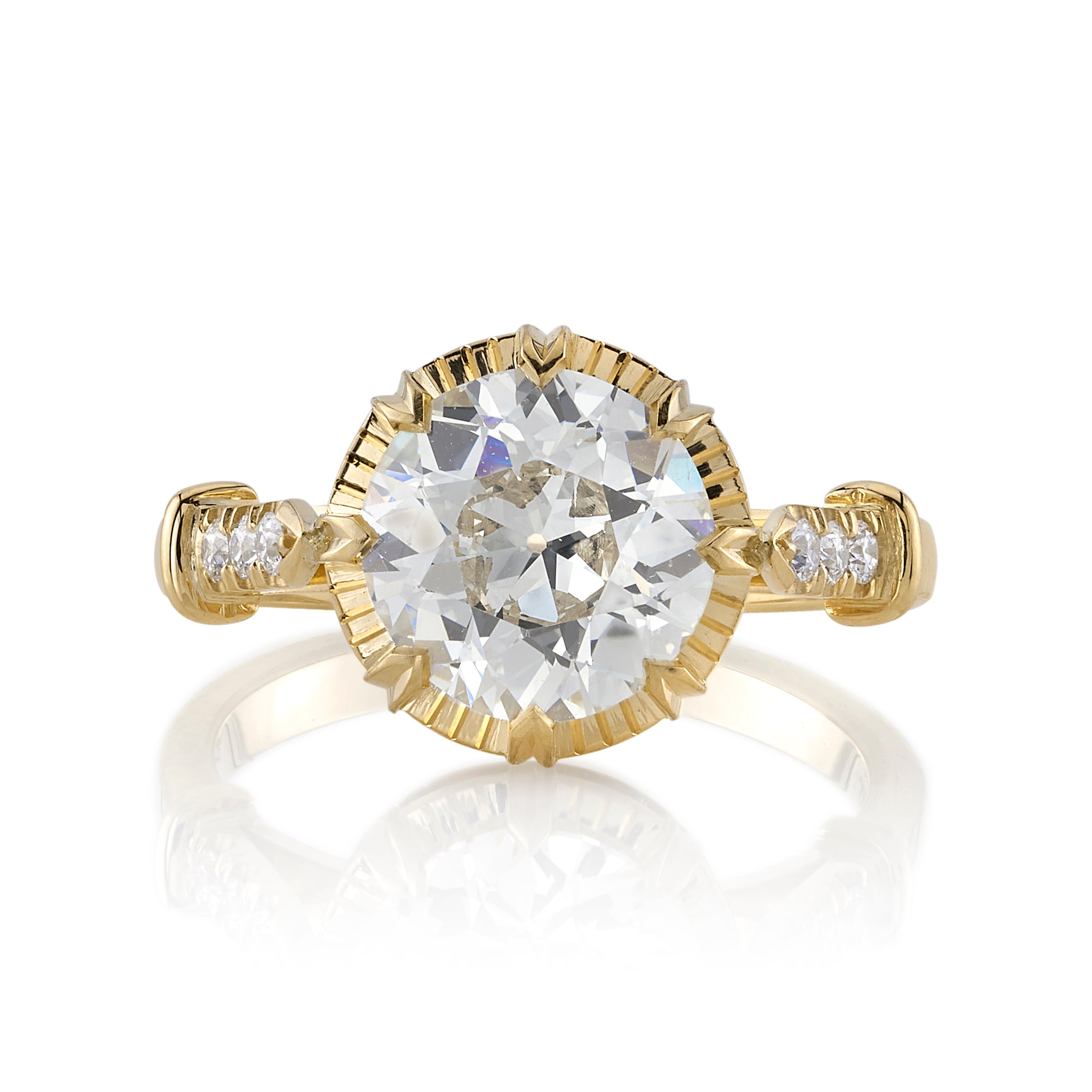 2.40ct L/SI1 GIA certified old European cut diamond with 0.13ctw old European cut accent diamonds prong set in a handcrafted 18K yellow gold mounting.