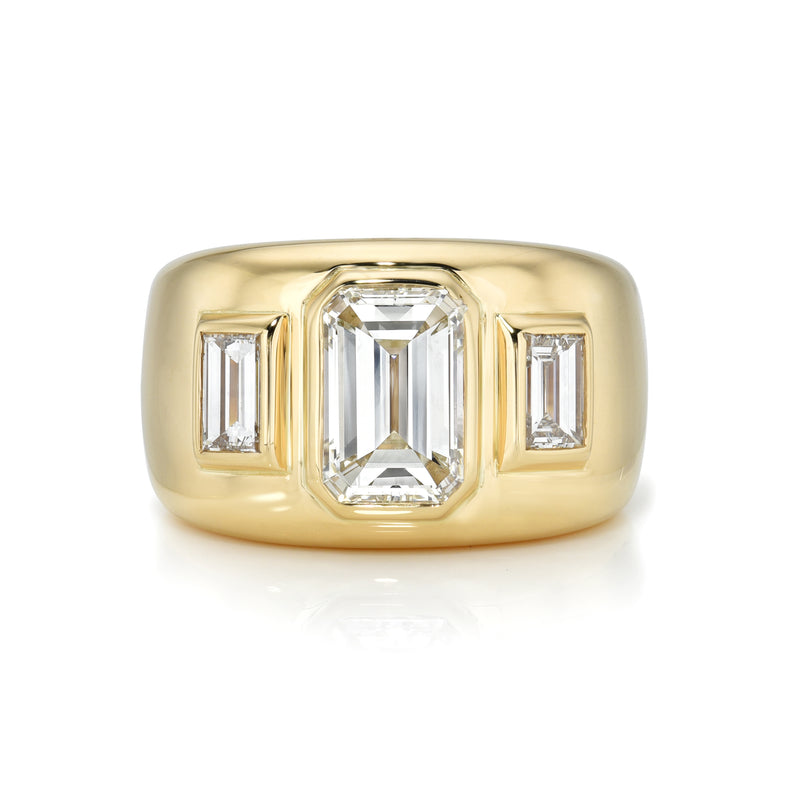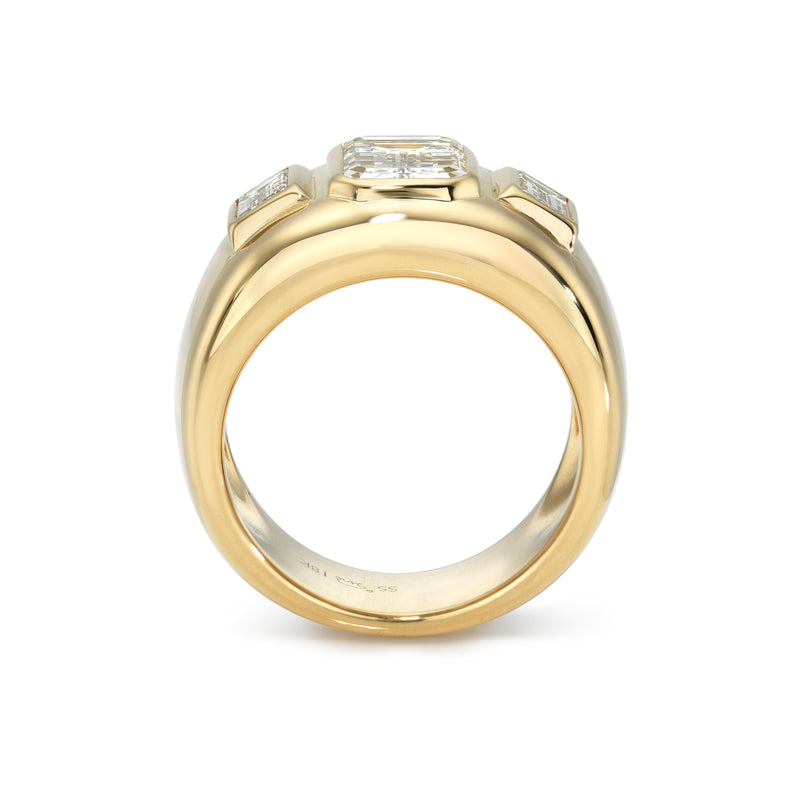 2.06ct L/VVS2 GIA certified emerald cut diamond with 0.62ctw baguette cut accent diamonds bezel set in a handcrafted 18K yellow gold mounting.