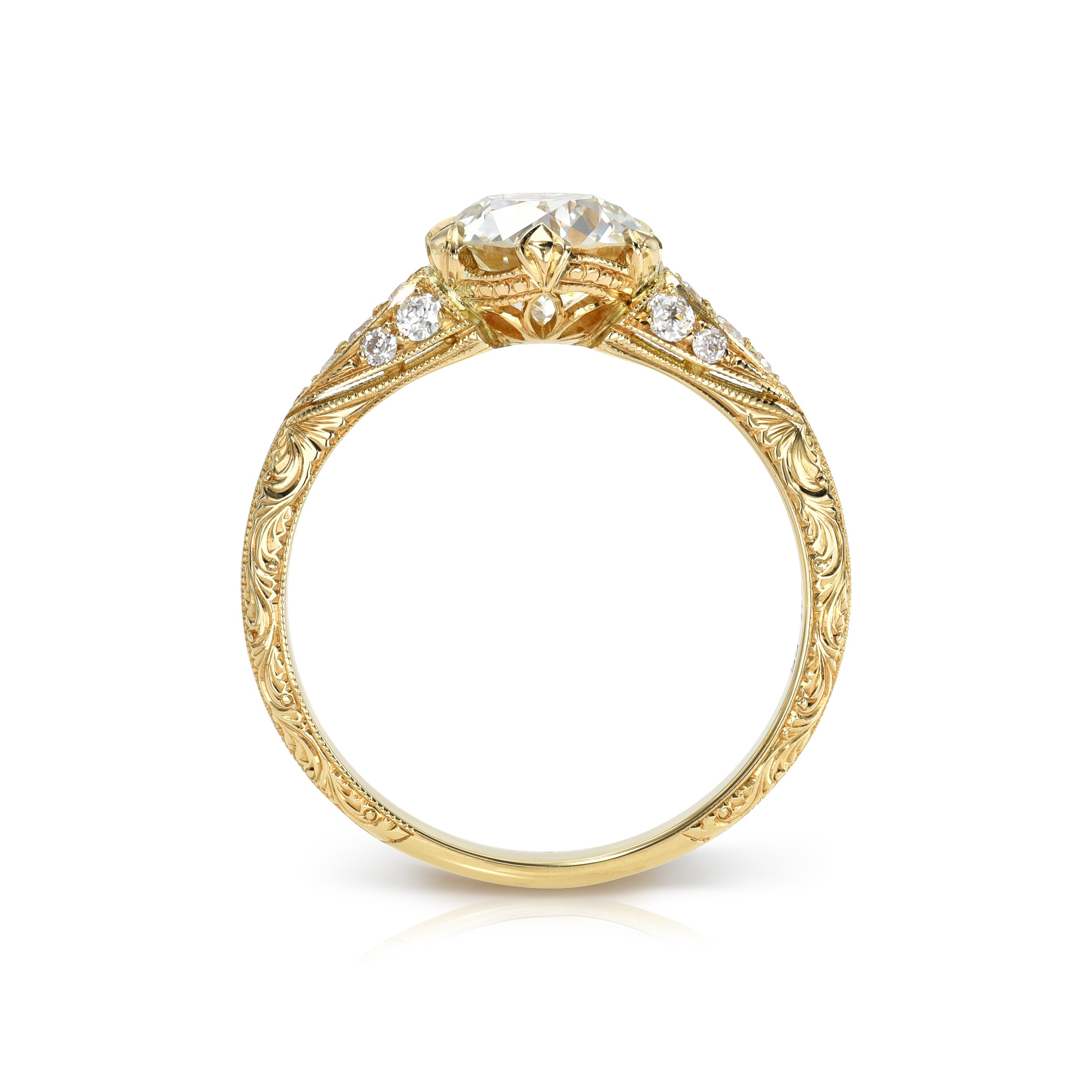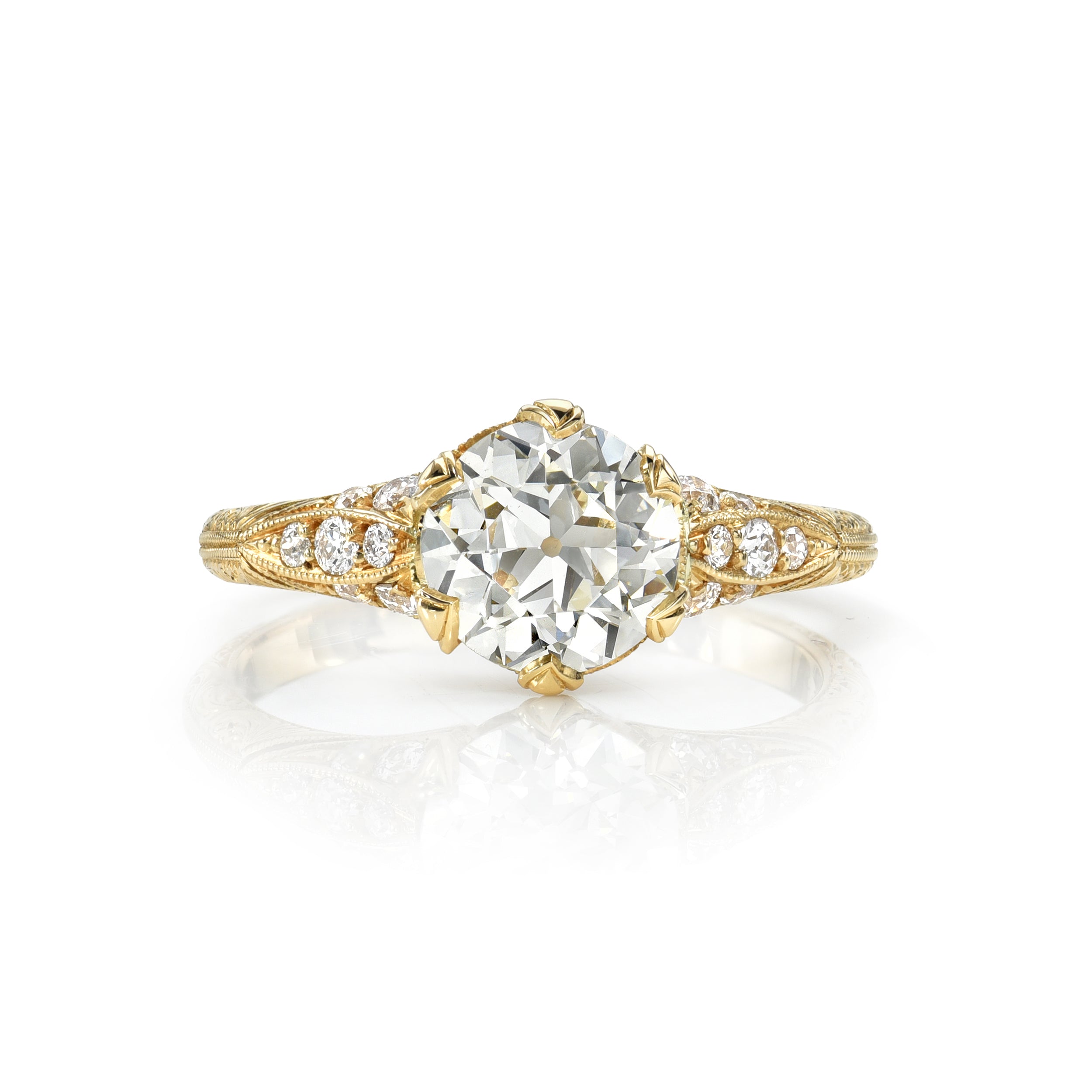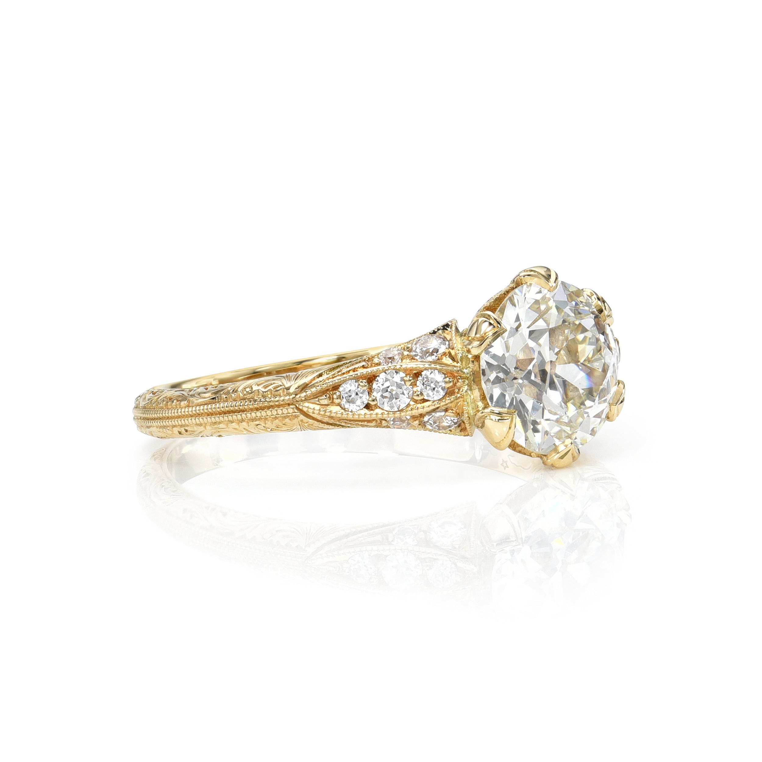 1.28ct L/VS1 GIA certified old European cut diamond with 0.14ctw old European cut accent diamonds set in a handcrafted 18K yellow gold mounting.