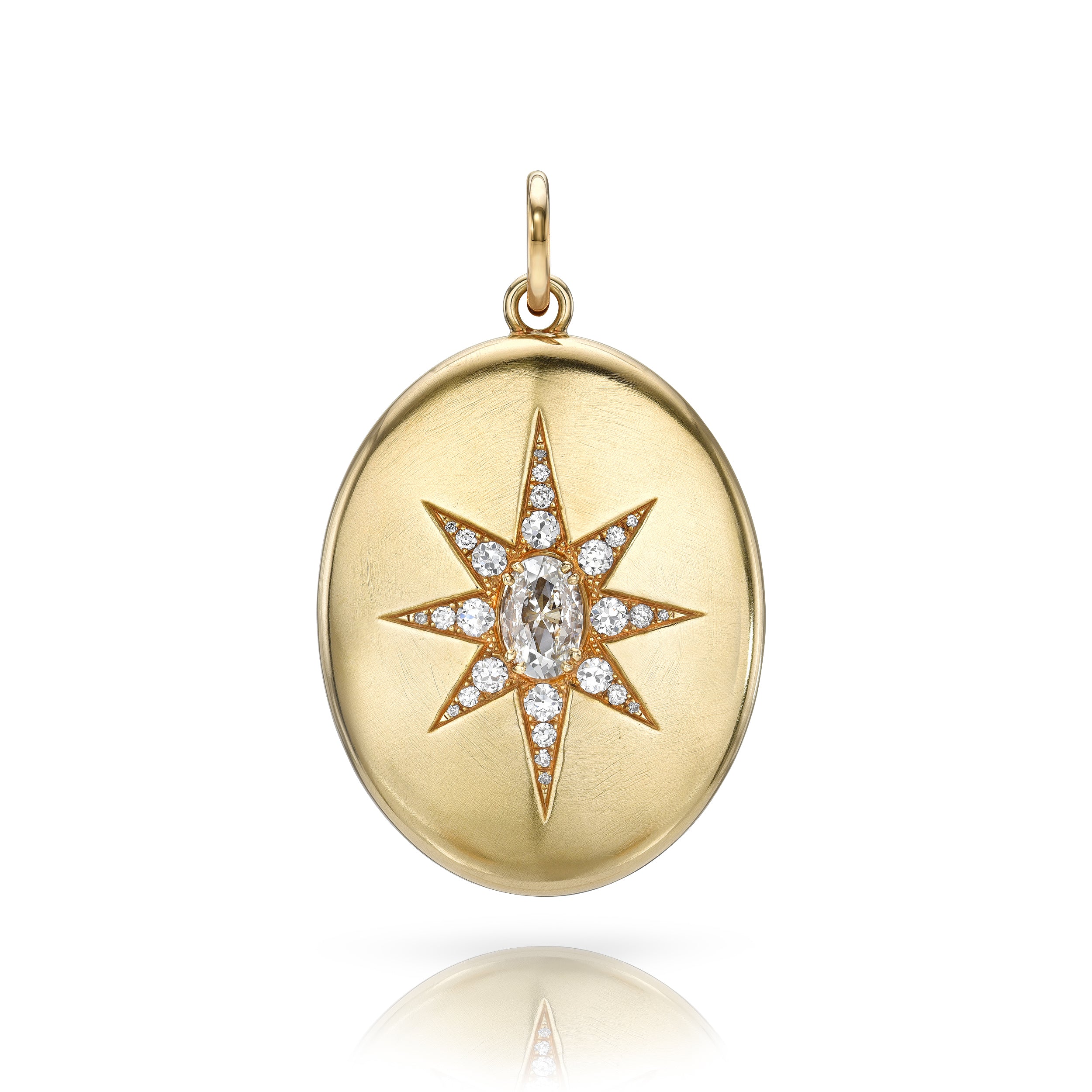 1.34ct H/VS2 GIA certified antique oval cut diamond arranged in a star motif with 0.98ctw old European cut accent diamonds set in a handcrafted, high polish 18K yellow gold pendant.